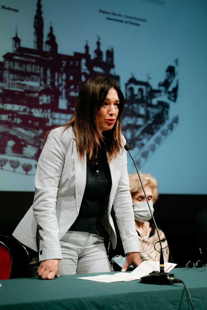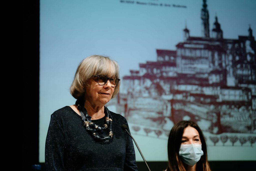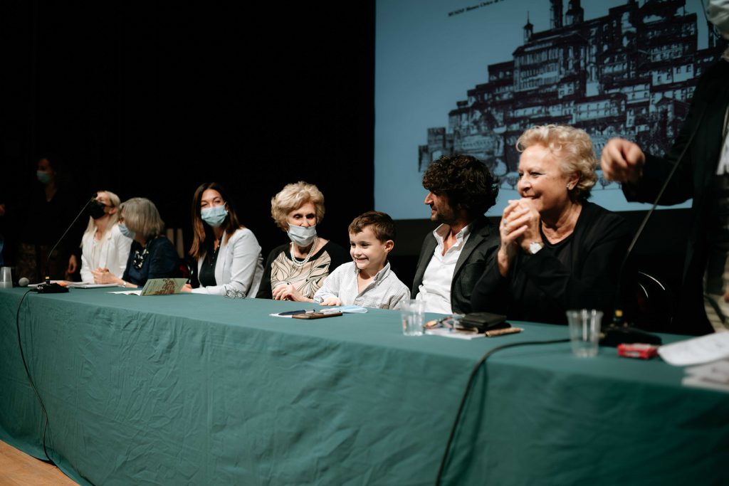 Sul palco il sindaco Matteo Principi, l’assessora alle Politiche culturali Giorgia Fabri, Luisa e Domizia Carafòli, rispettivamente moglie e figlia di Mario, la senatrice Silvana Amati, l’assessora ai Servizi alla persona e Pari opportunità del Comune di Senigallia, Cinzia Petetta e il prof. Gian Mario Raggetti direttore del Musinf.