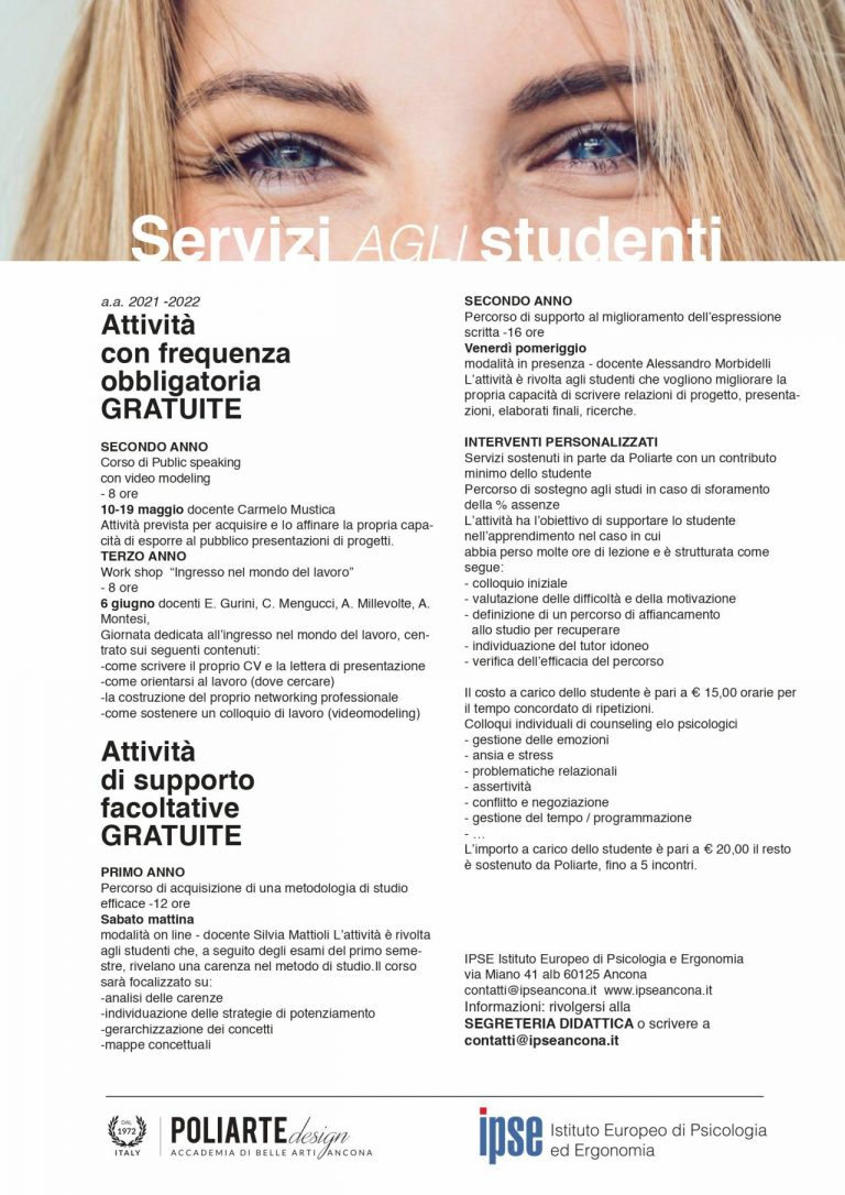A fianco dell’Accademia di belle arti e #design Poliarte di Ancona, come è noto, da 50 anni opera l’IPSE, l’Istituto Europeo di #Psicologia e di #Ergonomia #Poliarte, nato con il compito precipuo di aiutare e sostenere il percorso formativo a livello apprenditivo, motivazionale e nella gestione del #lavoro individuale e di gruppo e per la negoziazione dei possibili conflitti sociodinamici intervenienti. In questo modo di anno in anno gli psicologi ed ergonomi, coadiuvati anche da esperti di altre professioni, hanno sviluppato programmi di servizi finalizzati alla #formazione integrale della persona, il ‘self cocept’ e delle #competenze del design, il ‘professional self concept’. Lo staff dei professionisti è guidato dalla dott.ssa Catia Mengucci ed è formato dalle Dott.sse Alessandra Millevolte, ilaria peppoloni, Michela G..