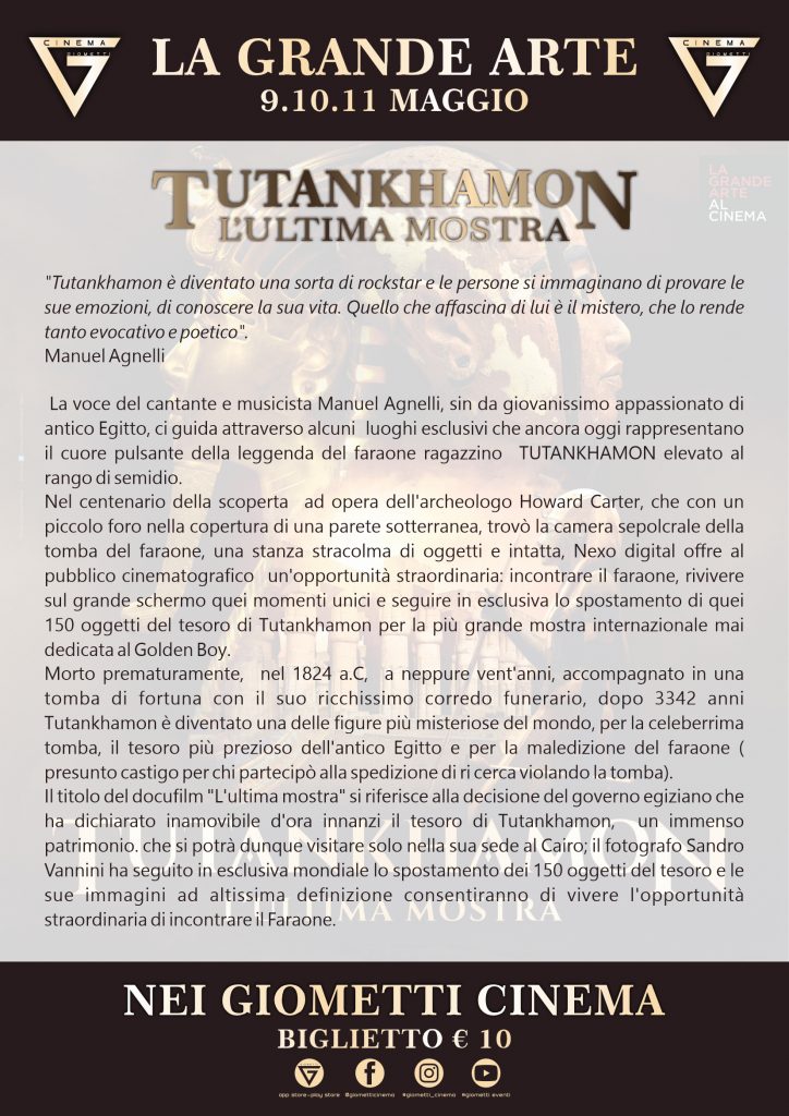 La voce del cantante e musicista Manuel Agnelli, sin da giovanissimo appassionato di antico Egitto, ci guida attraverso alcuni luoghi esclusivi che ancora oggi rappresentano il cuore pulsante della leggenda del faraone ragazzino TUTANKHAMON elevato al rango di semidio. Nel centenario della scoperta ad opera dell’archeologo Howard Carter, che con un piccolo foro nella copertura di una parete sotterranea, trovò la camera sepolcrale della tomba del faraone, una stanza stracolma di oggetti e intatta, Nexo digital offre al pubblico cinematografico un’opportunità straordinaria: incontrare il faraone, rivivere sul grande schermo quei momenti unici e seguire in esclusiva lo spostamento di quei 150 oggetti del tesoro di Tutankhamon per la più grande mostra internazionale mai dedicata al Golden Boy.