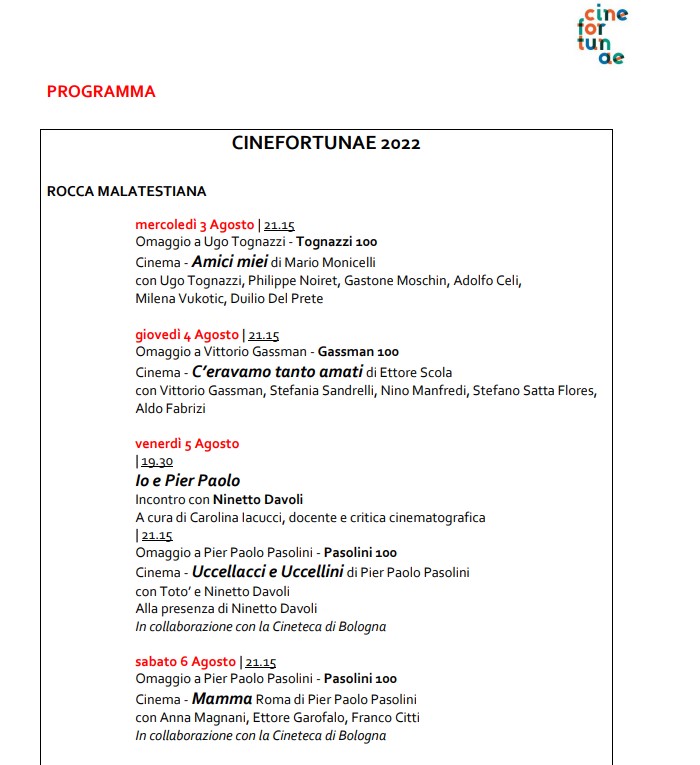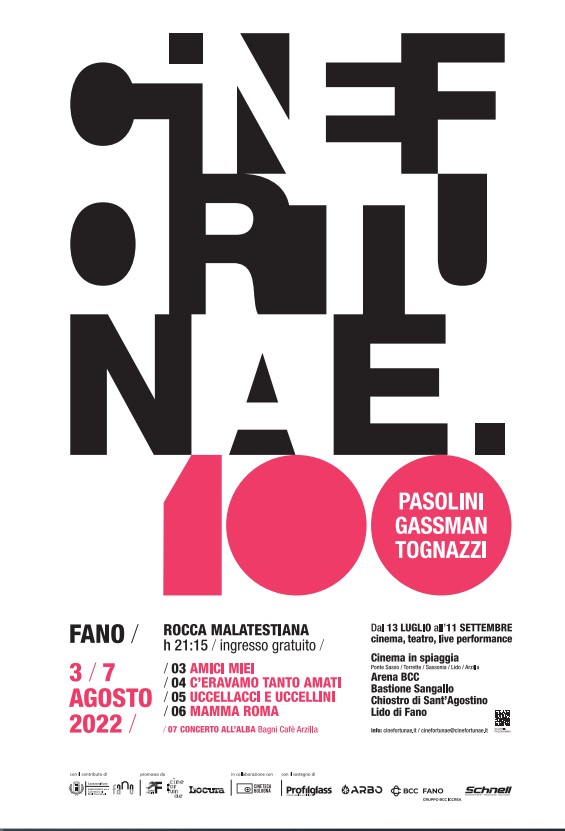 Torna a Fano con una lunga serie di eventi, dal 13 luglio all’11 settembre, CineFortunae – Capolavori Restaurati by the Sea, la rassegna di cinema promossa da FanoFellini e dall’Associazione La Locura, con il contributo del Comune di Fano Assessorato alla Cultura, in collaborazione con Cineteca Bologna e con il sostegno di Profilglass, Arbo, BCC Banca di Credito Cooperativo di Fano, Schnell. Dopo l’omaggio a Federico Fellini nel 2020 e quello a quattro straordinarie interpreti del nostro cinema (Giulietta Masina, Anna Magnani, Sophia Loren e Monica Vitti) nel 2021, l’edizione 2022 vedrà protagonisti Pier Paolo Pasolini, Ugo Tognazzi e Vittorio Gassman, in occasione del centenario della loro nascita.