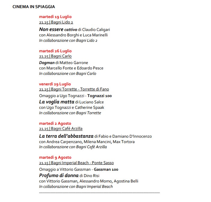 Al cinema alla Rocca si aggiunge Cinema in spiaggia che vedrà omaggi a Gassman e Tognazzi e la proiezione di tre film recenti, espressione dell’eredità del cinema pasoliniano. Cinque proiezioni (inizio ore 21.15) in altrettanti stabilimenti balneari del litorale fanese: 19 luglio, Bagni Lido 2, “Non essere cattivo” di Claudio Caligari con Alessandro Borghi e Luca Marinelli; 26 luglio, Bagni Carlo, “Dogman” di Matteo Garrone con Marcello Fonte e Edoardo Pesce; 29 luglio, Bagni Torrette – Torrette di Fano, “La voglia matta” di Luciano Salce con Ugo Tognazzi e Catherine Spaak; 2 agosto, Bagni Café Arzilla, “La terra dell’abbastanza” di Fabio e Damiano D’Innocenzo con Andrea Carpenzano, Milena Mancini e Max Tortora; 9 agosto, Bagni Imperial Beach – Ponte Sasso, “Profumo di donna” di Dino Risi con Vittorio Gassman, Alessandro Momo e Agostina Belli.