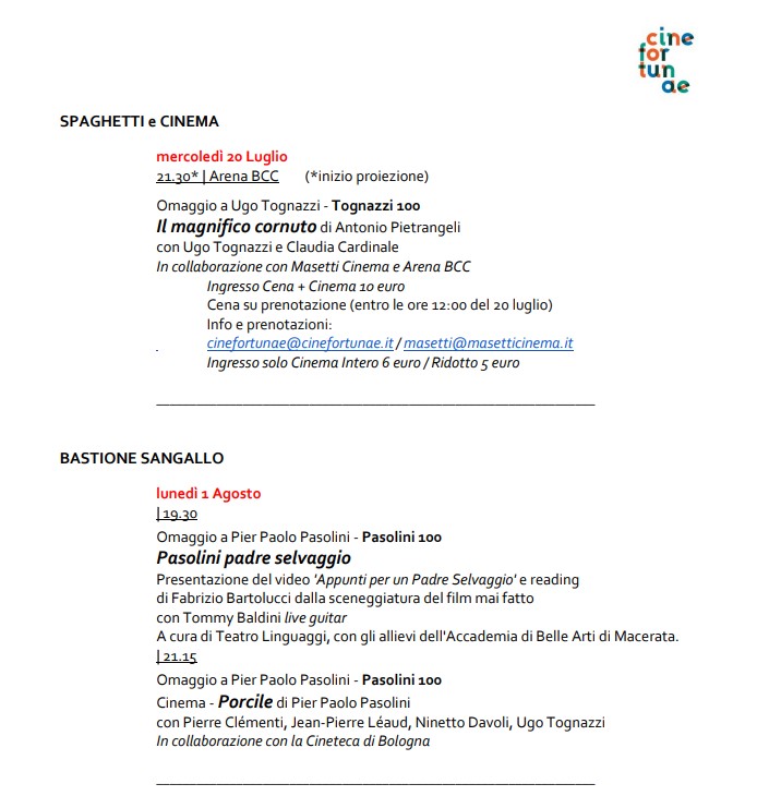 Per info: cinefortunae@cinefortunae.it Il programma potrà subire variazioni. Per aggiornamenti: