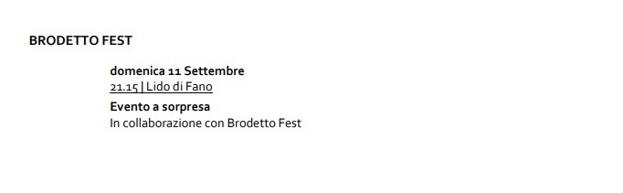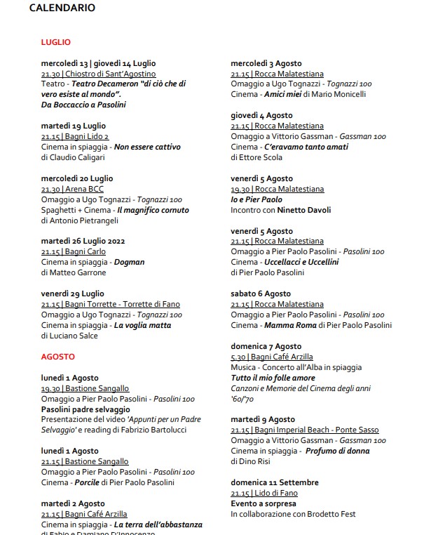 In caso di maltempo: nei giorni 5 agosto e 6 agosto l’incontro con Ninetto Davoli e le proiezioni di “Uccellacci e Uccellini” e “Mamma Roma” si svolgeranno presso il Cinema Masetti di Fano, via Don Bosco 12; nei giorni 3 agosto e 4 agosto la proiezione di “Amici Miei” verrà recuperata domenica 7 agosto e la proiezione di “C’eravamo tanto amati” verrà recuperata venerdì 12 agosto presso il Cinema Masetti di Fano, via Don Bosco 12.