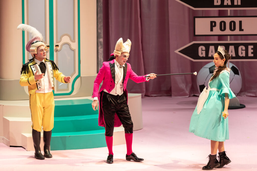 Nella regia ideata da Daniele Menghini, il padre di famiglia Don Magnifico – che si trova ormai sul lastrico dopo aver sperperato tutta l’eredità di Cenerentola per soddisfare i capricci delle figlie – trasforma il suo palazzo in un Grand Hotel, con la speranza di risollevare le finanze della casa. Ritagliandosi il ruolo di concierge, obbliga Cenerentola a vestire gli abiti della cameriera e ne fa la sua serva, concedendo alle figlie Clorinda e Tisbe di vivere da eterne vacanziere, servite e riverite dalla povera sorellastra. Un bel giorno, la visita inaspettata di un ospite speciale cambierà le sorti della fanciulla maltrattata: il principe Ramiro in persona, accompagnato dal cameriere Dandini, ha scelto proprio il famoso Salone delle delizie del Grand Hotel per dare un gran ballo e sposare così la fanciulla dal cuore più puro di tutto il regno. Cenerentola con la sua bontà riuscirà a conquistare il cuore del principe, aiutata dal buon Alidoro, il pony express dei sogni che sfreccia in lungo e in largo per il regno, realizzando i desideri dei cuori gentili.