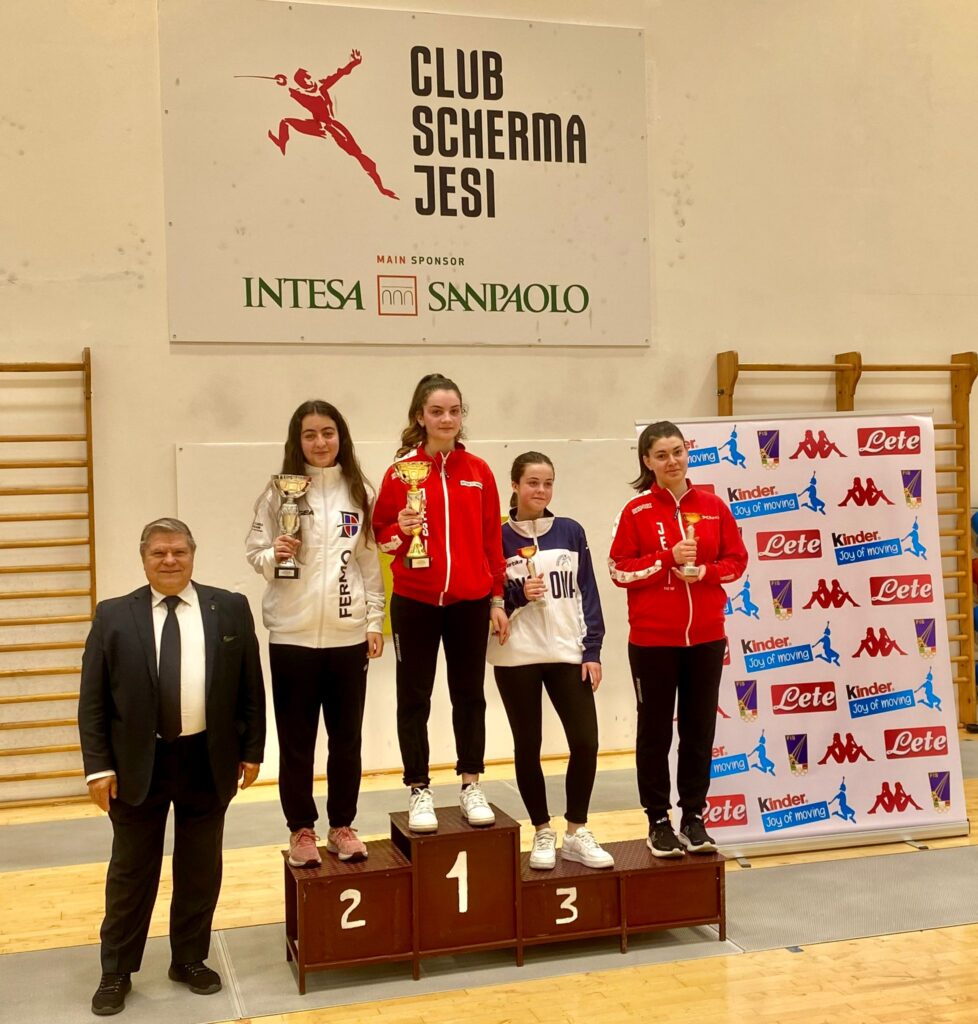 Nelle prove di domenica dedicate al Fioretto femminile, Lucrezia Monti del Club Scherma Jesi ha solcato il 1° gradino del podio. 2° piazzamento per Maria Lucia Bonfigli dell’Accademia della Scherma Fermo. 3° Sophia Di Palo del Club Scherma Ancona insieme a Maria Angelica Rossolini del Club Scherma Jesi. Queste quattro fiorettiste sono qualificate per il Gold. 5° e 6° Ginevra Guerrini e Margherita Frulla del Club Scherma Jesi, 7° Giulia Carpiceci dell’Accademia Scherma Fermo, 8° Ludovica Grisanti del Club Scherma La Misericordia Osimo, 9 rispettivamente Elisa Adoul del Club Scherma Ancona e 10° Annalisa Barbano del Club Scherma Pesaro. Queste atlete passano alla fase nazionale Silver.