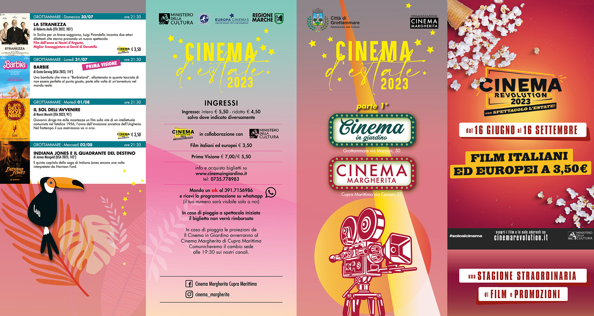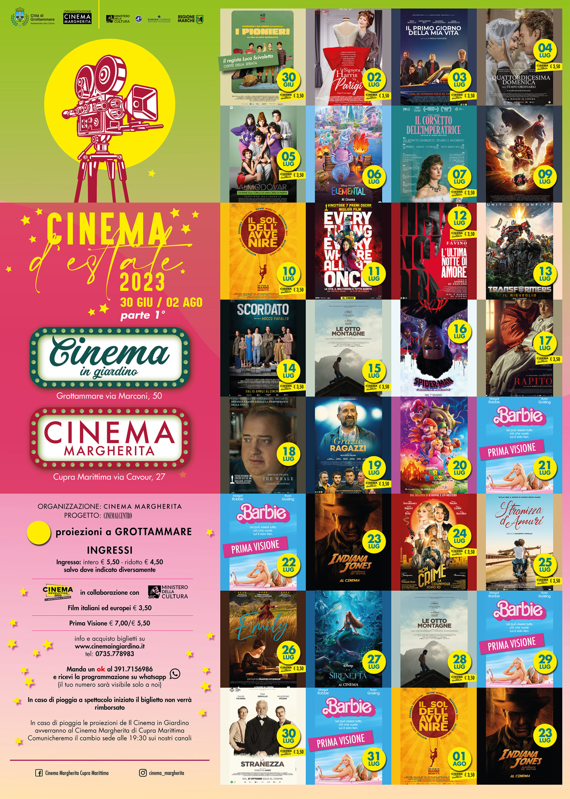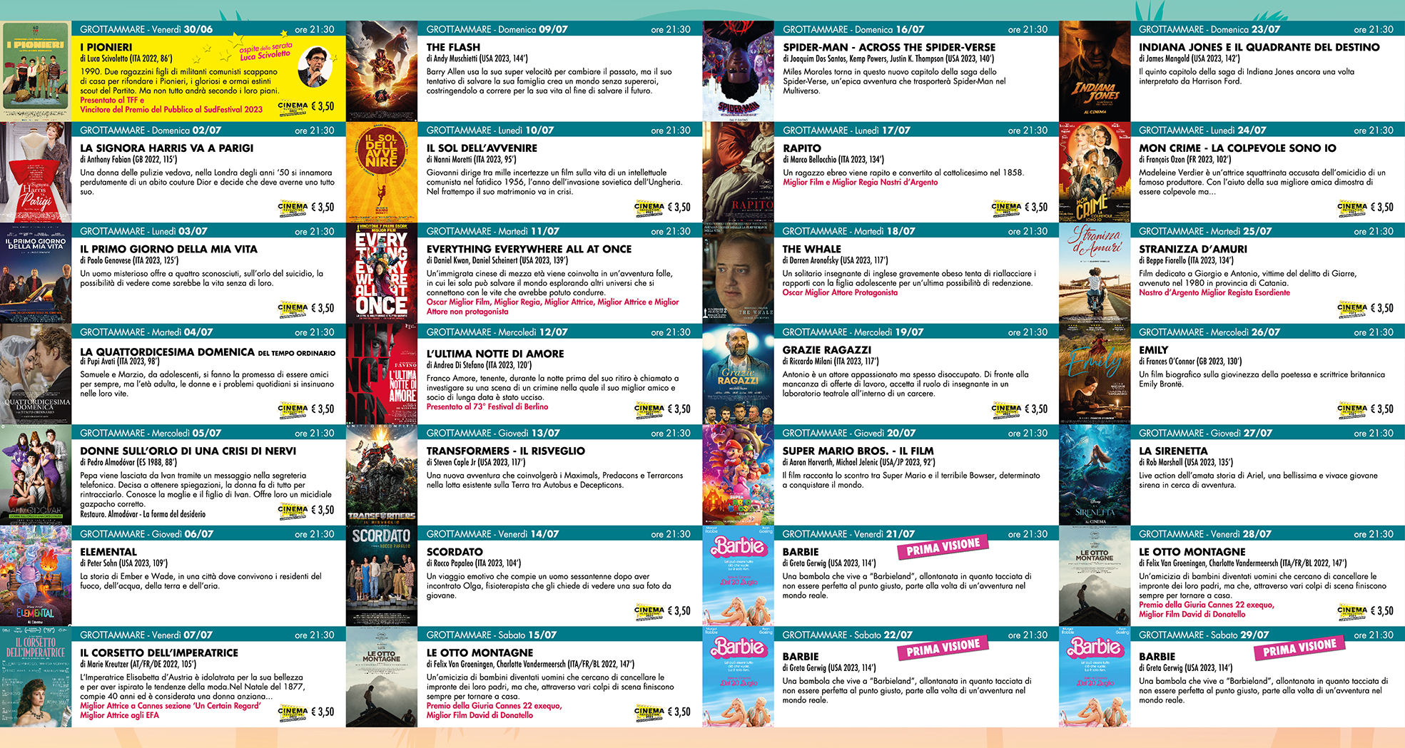 Tante nuove uscite importanti come Indiana Jones vol. 5, Flash, Mission impossible 7,Barbie e, per i più piccoli, il film di animazione Elemenal, ma anche la possibilità di vedere tutte le produzioni italiane ed europee al prezzo specialissimo di 3,5€