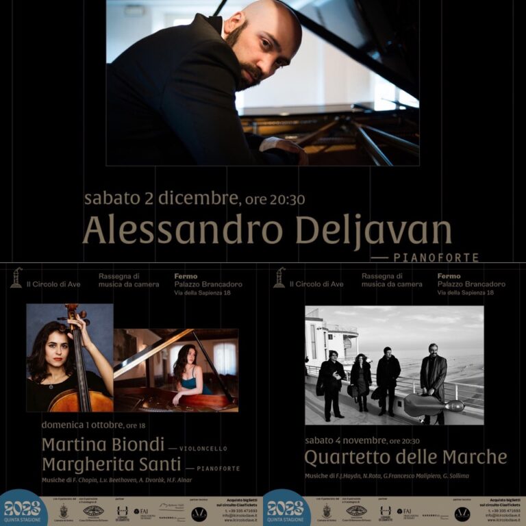 Il Circolo di Ave, associazione di promozione sociale, opera dal maggio 2019 nel settore della musica classica a Fermo. La sua finalità principale consiste nel diffondere la musica classica nel territorio fermano e non solo, attraverso un’offerta destinata al panorama degli “appassionati” con uno sguardo rivolto al pubblico dei più giovani. In tale contesto, Il Circolo di Ave ha ideato e promosso la rassegna di musica da camera – giunta nel 2023 alla sua V edizione – ospitata a Palazzo Brancadoro, Fermo, dimora storica A.D.S.I. – Associazione Dimore Storiche Italiane. Nella dimora di fine ‘600, si coniuga in maniera ideale l’obiettivo di ospitare artisti, sia emergenti che già affermati, di alto profilo del panorama nazionale e internazionale della musica classica; in questo modo, la musica torna nei luoghi in cui era naturale ascoltarla e dove è nata, contribuendo a rendere più agevole e fruibile il suo ascolto e facendola tornare nuovamente protagonista.