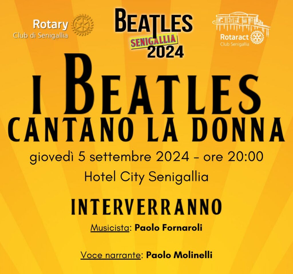 Giovedì 5 settembre 2024 ore 20.00: Hotel City – Evento riservato al Rotary e Rotaract Club Senigallia – Poesia & Musica–I BEATLES CANTANO la DONNA (Paolo Fornaroli chitarra acustica/voce, Paolo Molinelli voce narrante). Introdurrà il Presidente del Rotary Club Senigallia Alessandro Marinelli e l’attrice Francesca Berardi ed Alessandro De Carlo del Rotaract leggeranno poesie e racconti.