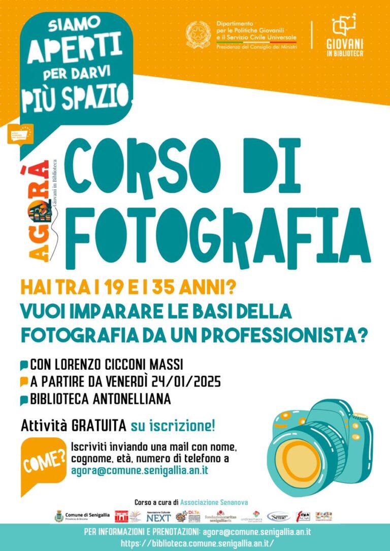 Il corso, su iscrizione e totalmente gratuito, grazie al progetto del Comune di Senigallia A.G.O.R.À. – Animazioni Giovanili per Occasioni Ricreative e Aggregative, sarà utile per imparare le basi della fotografia e cimentarsi in un’arte meravigliosa. Otto incontri teorico-pratici e altri tre incontri con talenti emergenti della fotografia italiana, una masterclass e momenti con gli artisti aperti al pubblico. Non solo: al termine del corso le opere dei partecipanti saranno esposte in una mostra allestita proprio all’interno della Biblioteca Antonelliana.