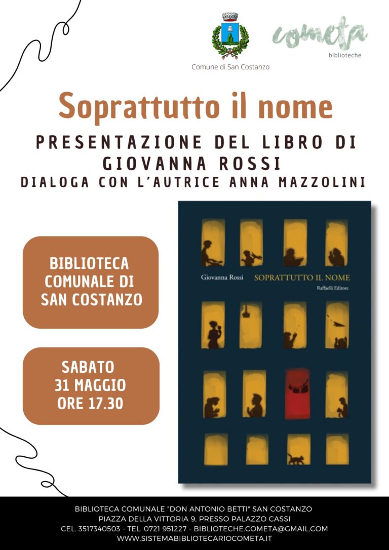 Sabato 31 maggio alle ore 17.30 la Biblioteca di San Costanzo ospiterà Giovanna Rossi che ci presenterà il suo libro d’esordio, Soprattutto il nome, pubblicato da Raffaelli Editore lo scorso anno. L’autrice ci parlerà della sua raccolta di racconti insieme a Anna Mazzolini, architetto urbanista, e all’editore Walter Raffaelli. Soprattutto il nome non è una raccolta di racconti. È piuttosto un romanzo che non ci ha creduto abbastanza. Il risultato è un insieme di fotografie, nomi, brevi storie indipendenti, ma non del