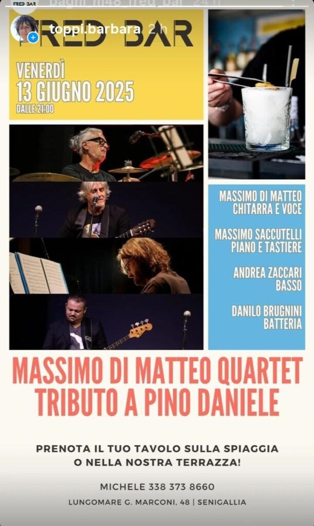 Live Tributo a Pino Daniele con Massimo Di Matteo Quartet venerdì 13 giugno alle 21:30 al Fred Bar Bagni M48 di Senigallia