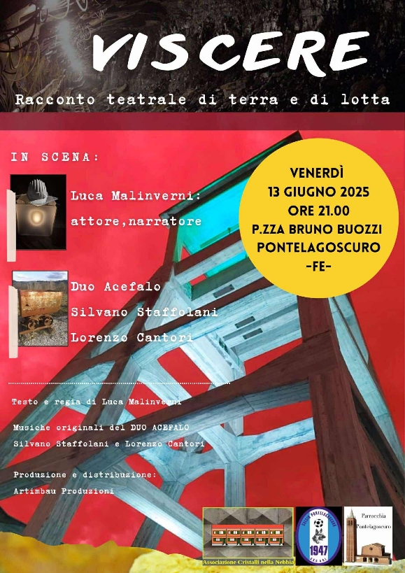 “Viscere, racconto teatrale di terra e di lotta” ha debuttato a Cabernardi il 4 dicembre del 2021 in quello che fu il vecchio teatro del dopolavoro minerario (anche se era già finito nel 2019). E dopo aver girato le Marche tra Leccia di Serra Sant’Abbondio, San Lorenzo in Campo, Castelbellino Pergola e Recanati troverà il suo approdo a Pontelagoscuro il 13 giugno del 2025 alle 21:00 sul palco della piazza centrale (piazza Bruno Buozzi) preceduto dalla presentazione di un podcast prodotto da Cristalli nella Nebbia.