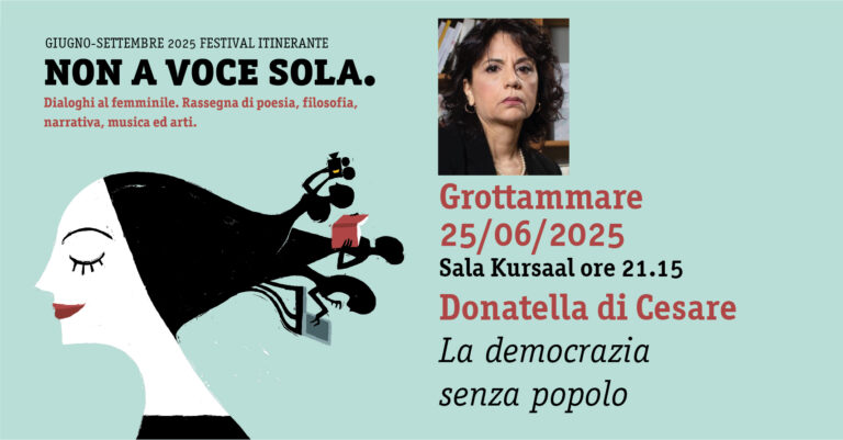 Il terzo appuntamento vedrà protagonista Donatella Di Cesare con un intervento dal titolo La democrazia senza popolo. L’evento si terrà mercoledì 25 giugno alle ore 21,15 nella splendida cornice di Piazza Kursaal a Grottammare.