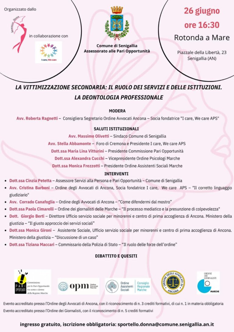 Senigallia si prepara ad ospitare un importante convegno intitolato “La Vittimizzazione Secondaria: Il Ruolo dei Servizi e delle Istituzioni. La Deontologia Professionale”, che si terrà giovedì 26 giugno alle ore 16:30 presso la Rotonda a Mare in Piazza della Libertà, 23, Senigallia. L’evento, organizzato dall’Assessorato alle Pari Opportunità del Comune di Senigallia in collaborazione con l’associazione “I Care, We Care APS” e l’associazione “Sentite Donne”, promette di essere un momento di riflessione cruciale su tematiche di grande rilevanza sociale e professionale.