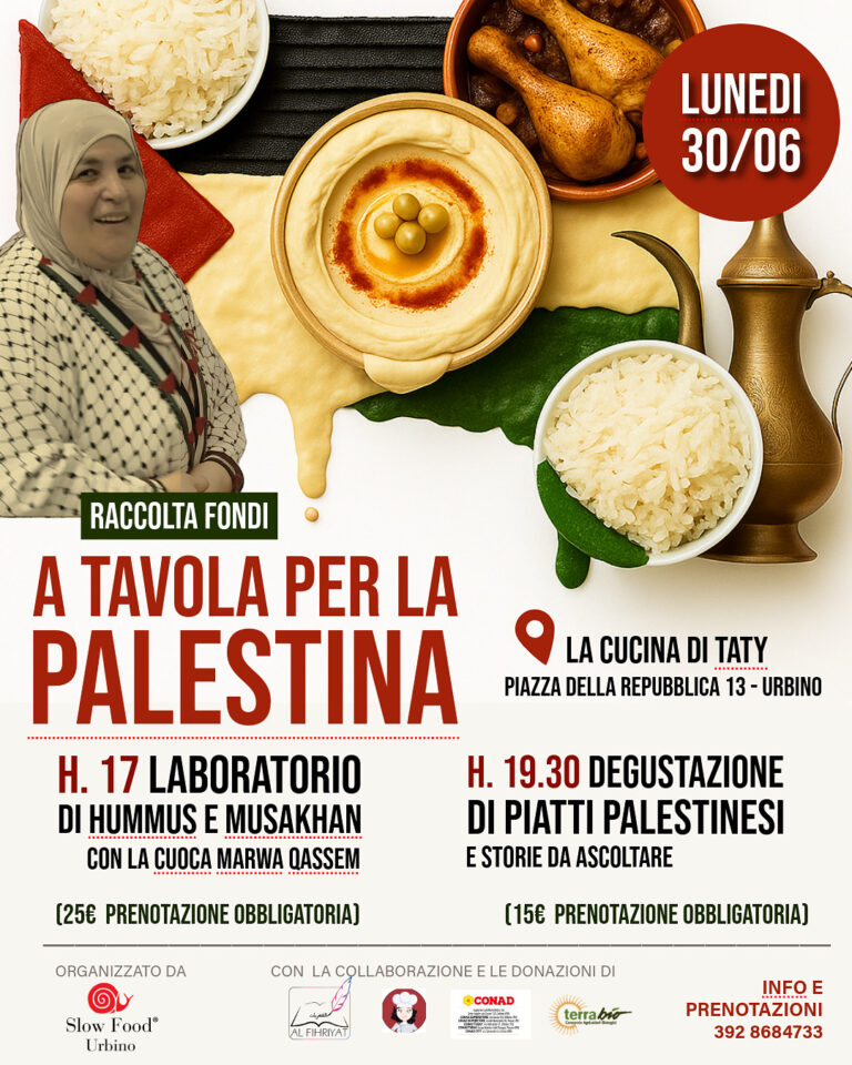 Lunedì 30 giugno, presso La Cucina di Taty, un laboratorio e una piccola cena per sostenere la popolazione palestinese. Organizza la Condotta Slow Food Urbino, in collaborazione con l’associazione Al Fihriyat di Fano.