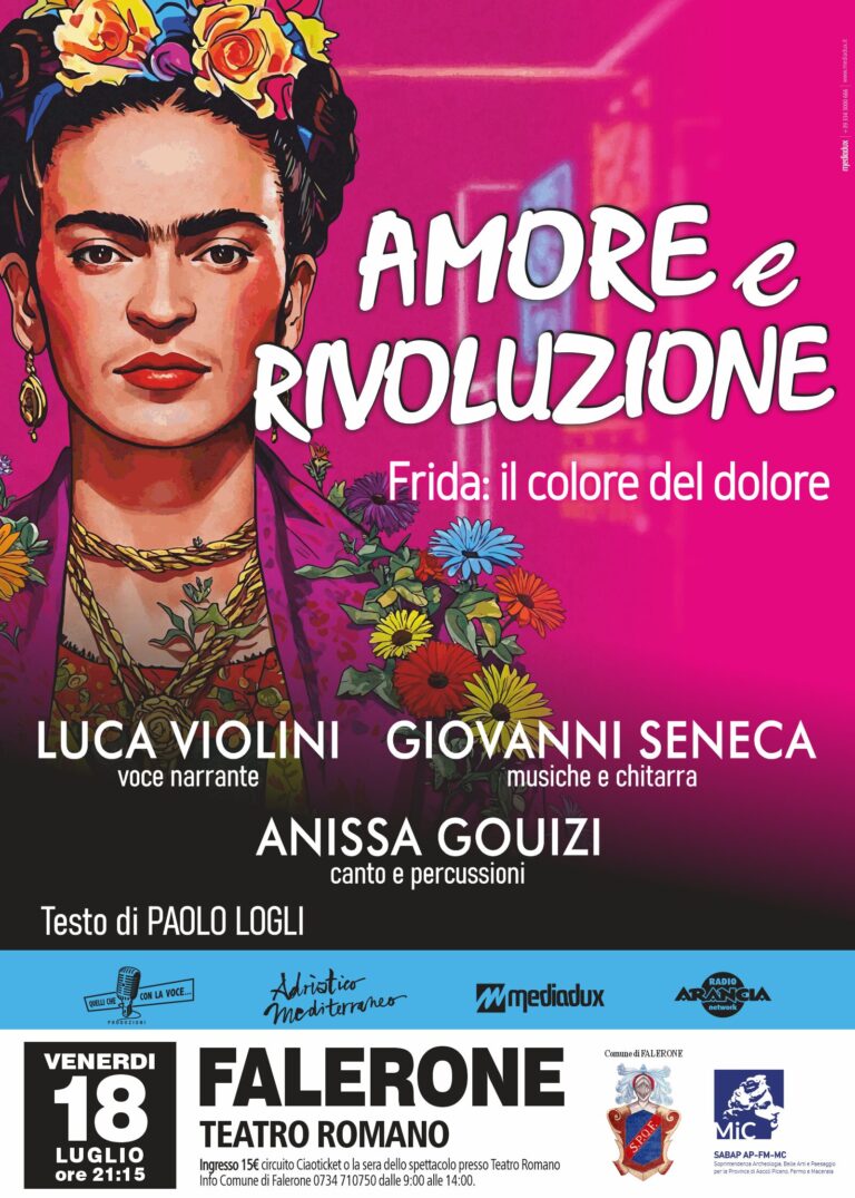 Sarà proprio Lev a narrarci Frida. Un monologo, scritto da Paolo Logli e interpretato dall’attore/doppiatore Luca Violini, in cui Prosa e Poesia danzano insieme alla Chitarra di Giovanni Seneca e al Canto e alle Percussioni di Anissa Gouizi che andranno a pennellare, a sottolineare e ad esaltare una serie di suggestioni e di stati d’animo, i momenti più struggenti, appassionati o più gioiosi. Musiche e Canti ispirati alle diverse Culture all’insegna dell’Amore e della Rivoluzione, temi cari a Frida Kahlo. La musica ebbe un grande ruolo nella Sua vita: la musica tradizionale del Messico, innanzitutto, con i mariachi e i balli di coppia, con le feste di paese e i canti al chiaro di luna. Ma anche il jazz americano, che lei amava moltissimo, e le canzoni francesi ed europee che ascoltò nei suoi pochi viaggi all’estero. Non era puro intrattenimento: la musica, per Frida, era passione, era la vibrazione dell’anima che entrava in sintonia con la sua terra e con i colori della sua pittura.