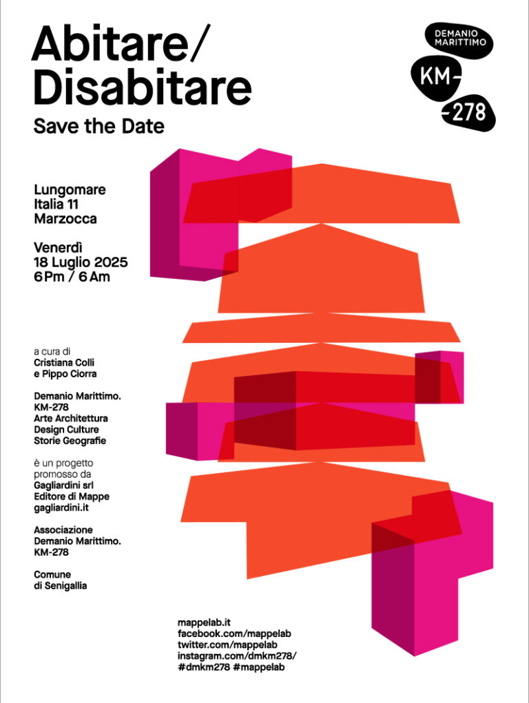 La manifestazione – durante la quale viene presentato il nuovo numero della rivista Mappe pubblicata da Gagliardini – è promossa dalla rivista MAPPE, Gagliardini Editore, dall’Associazione Demanio Marittimo.Km-278 con la collaborazione del MAXXI, del Comune di Senigallia, della Regione Marche, del MAO Museo d’Arte Orientale di Torino, ADI MAM, Inarch, dalle Università di Ancona e Camerino, dagli Ordini professionali di Architetti e Ingegneri, e con il supporto di un’ampia rete di imprese, istituzioni e associazioni tra cui quest’anno spicca l’Agenzia Spaziale Europea (ESA).