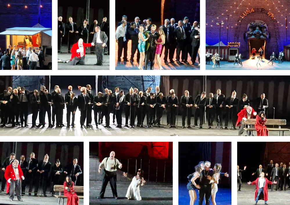 Federico Grazzini conferma il suo taglio ruvido e contemporaneo, trasferendo la vicenda dei cortigiani di Mantova in un pulp-thriller ambientato in un circo abbandonato. L’atmosfera di gang e sicari rende la violenza del dramma ancora più scabra e immediata, specialmente nel terzo atto dove l’omicidio di Gilda assume i toni di un vero thriller cinematografico. Grazzini rinuncia alla tradizionale gobba di Rigoletto, concentrandosi invece sulla deformazione morale del personaggio e sul duplice tema della maschera, sia come censura sia come finzione sociale. Il pagliaccio gigante sul palco non diverte, ma incute timore, incarnando l’ambiguità tra apparenza e verità insita nell’opera verdiana. Un allestimento che va in scena per la terza volta allo Sferisterio dopo il debutto del 2015.