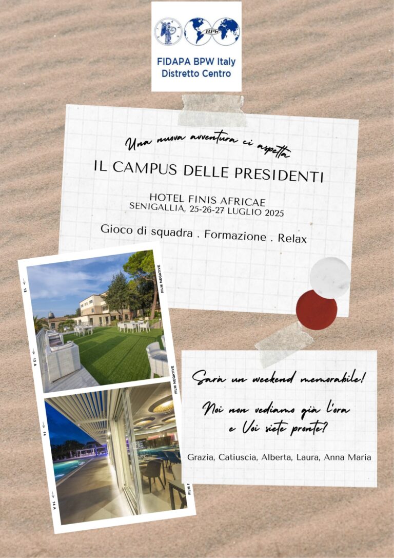 Il Distretto Centro della FIDAPA BPW Italy si prepara ad accogliere Presidenti e Socie per il suo attesissimo Campus “Cominciamo da noi”, un weekend intensivo dedicato allo sviluppo della leadership e alla creazione di sinergie. L’evento si terrà dal 25 al 27 luglio 2025 presso il Finis Africae di Senigallia, promettendo un’esperienza arricchente e trasformativa.