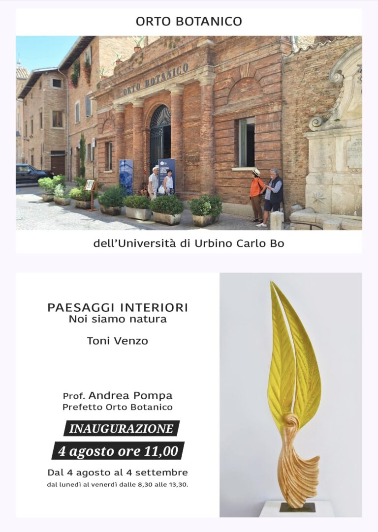 Lunedi 4 agosto alle ore 11,00 presso l’Orto Botanico dell’Università di Urbino sarà inaugurata la mostra di scultura “Paesaggi Interiori-Noi Siamo Natura” dell’artista Toni Venzo.
