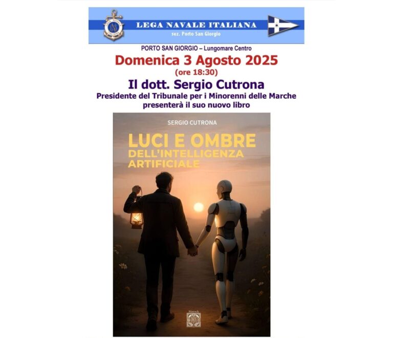 La Lega Navale Italiana, sezione di Porto San Giorgio, ospiterà un appuntamento culturale di grande attualità domenica 3 agosto alle ore 18:30, sul Lungomare Centro. Il protagonista sarà il dott. Sergio Cutrona, Presidente del Tribunale per i Minorenni delle Marche, che presenterà il suo nuovo libro: “Luci e ombre dell’intelligenza artificiale”.