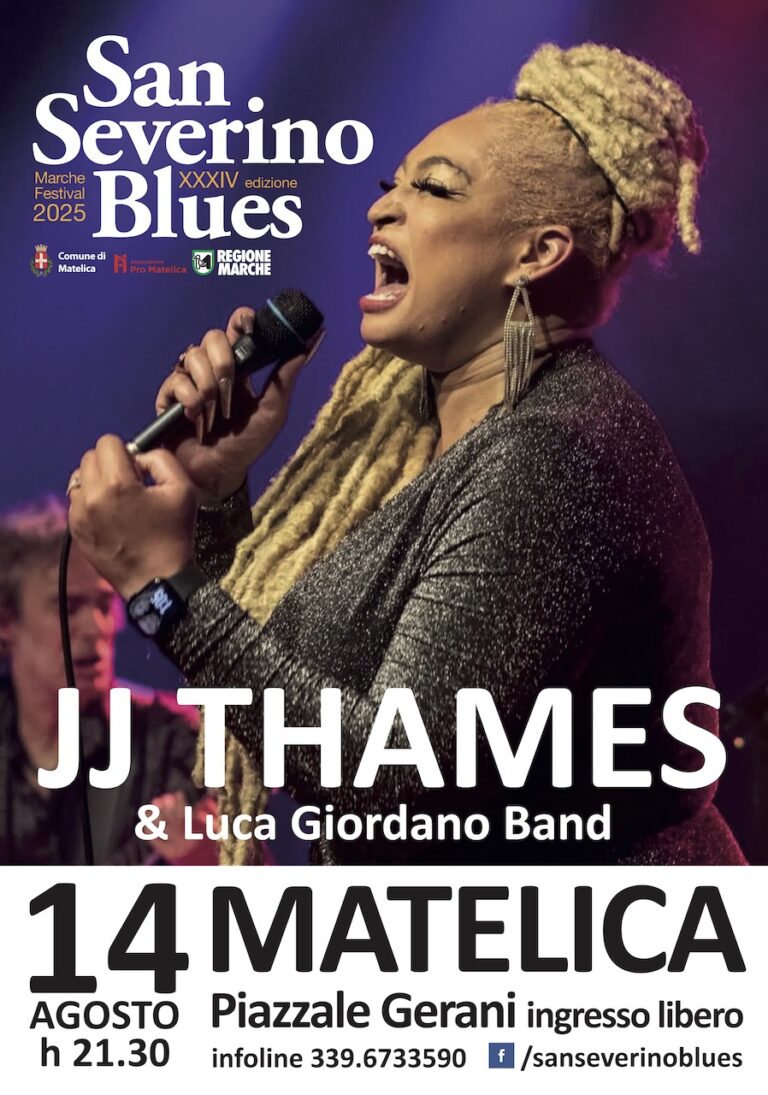 Giovedì 14 agosto alle 21,30 sul palco di piazzale Gerani a Matelica salirà l’esplosiva cantante americana JJ Thames, accompagnata dalla Luca Giordano band. È l’evento conclusivo del 34° San Severino Blues, realizzato grazie al sostegno dell’Amministrazione Comunale di Matelica e della Proloco locale.