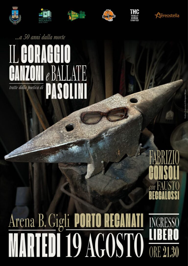 “Il coraggio – canzoni e ballate tratte dalla poetica di Pasolini”, torna ad essere un concerto e inizia a girare l’Italia. È in programma, martedì 19 agosto, ore 21.30 all’Arena Gigli di Porto Recanati (ingresso libero), la prima nazionale del lungo tour del cantautore e musicista Fabrizio Consoli accompagnato dal grande fisarmonicista Fausto Beccalossi tratto dall’omonimo album (Aereostella) uscito all’inizio dell’estate, proprio nel cinquantennale della scomparsa dell’intellettuale del ‘900.