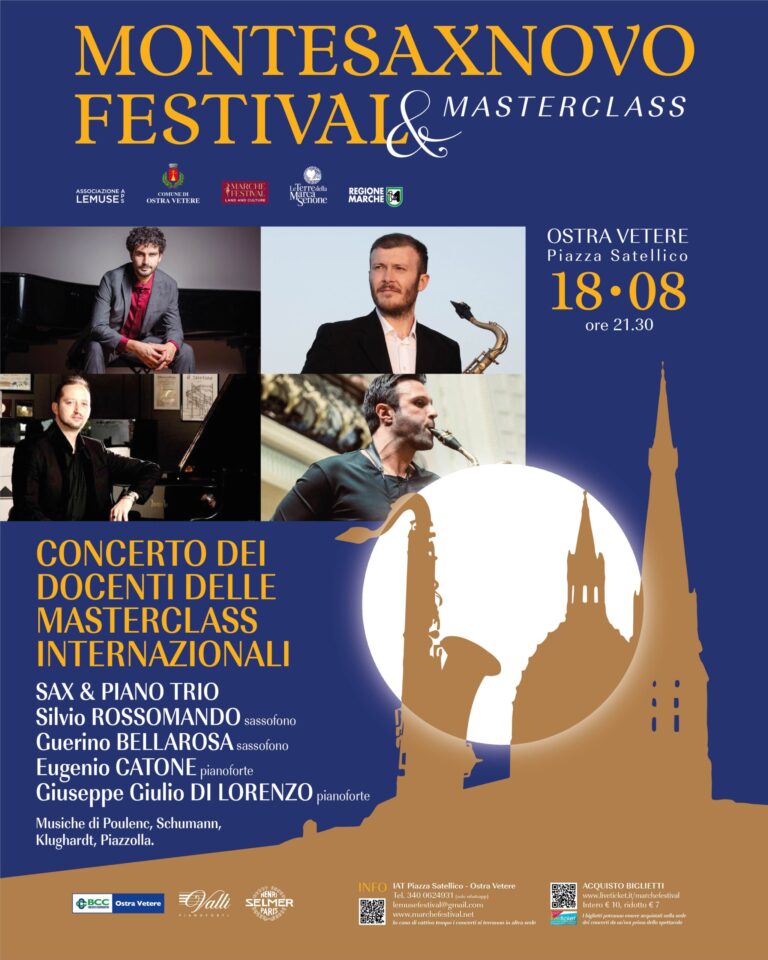 Il 18 agosto si terrà il concerto dei docenti delle Masterclass Internazionali con i sassofonisti Silvio Rossomando, Guerino Bellarosa e i pianisti Eugenio Catone e Giuseppe Giulio Di Lorenzo che si esibiranno al Montesaxnovo Festival & Masterclass dando il via al programma particolarmente ricco di questa edizione.