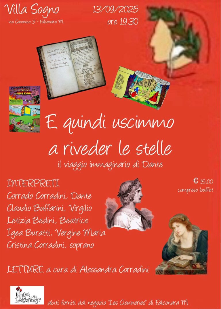 In occasione dell’anniversario della morte di Dante Alighieri sabato 13 settembre Cristina Corradini rende omaggio al Sommo Poeta con una serata dedicata alla Divina Commedia. Un viaggio tra Inferno, Purgatorio e Paradiso realizzato a Villa Sogno di Falconara Marittima, una cornice suggestiva affacciata sull’Adriatico per uno dei massimi capolavori mai stati scritti. L’evento, scritto e organizzato da Cristina Corradini in collaborazione con attori amatoriali, trasforma la location in un palcoscenico di luci, parole e musiche.