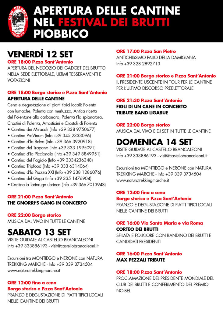 Il Festival dei Brutti sta per tornare a Piobbico con un lungo weekend. Dalle due giornate degli scorsi anni si passa a tre! L’appuntamento con la kermesse è dal 12 al 14 settembre nel centro storico del paese dove, dal 1879, ha sede lo storico Club dei Brutti che conta migliaia di associati da tutto il mondo. Festival con musica live, sfilata, folklore e cantine aperte.