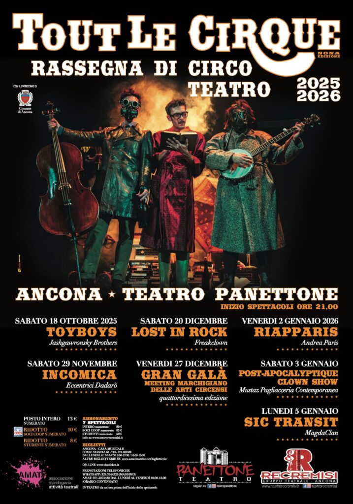Tre le rassegna anche per questa stagione 2025/2026 del Teatro Panettone: Made in marche, Tout le Cirque e Teatro Contemporaneo, un circuito chee si snoda tra prosa, circo teatro, comico e sperimentale con la presenza di importanti artisti che faranno tappa ad Ancona con i loro tour per l’Italia.