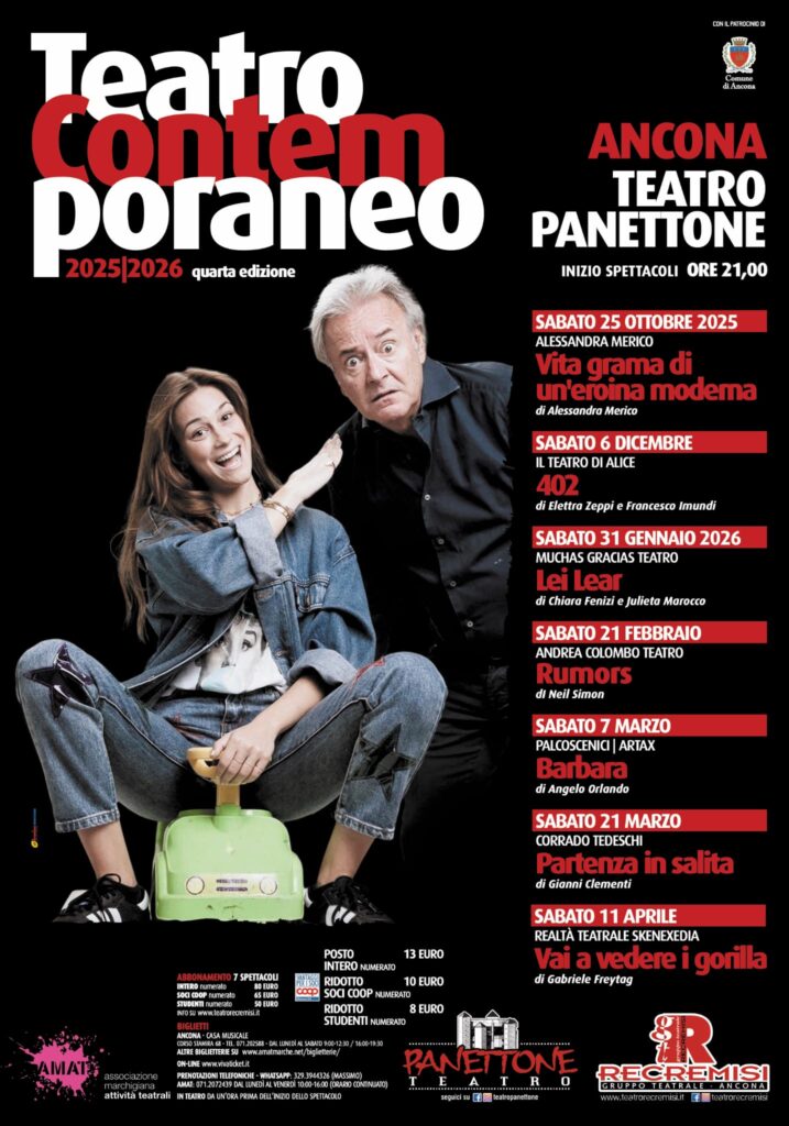 Uno dei più grandi cartelloni della regione con 21 spettacoli ed oltre 50 artisti professionisti provenienti da tutta Italia: è quello messo a punto al TEATRO PANETTONE dal Gruppo Teatrale Recremisi APS, in collaborazione con AMAT Associazione Marchigiana Attività Teatrali e con il patrocinio del Comune di Ancona.