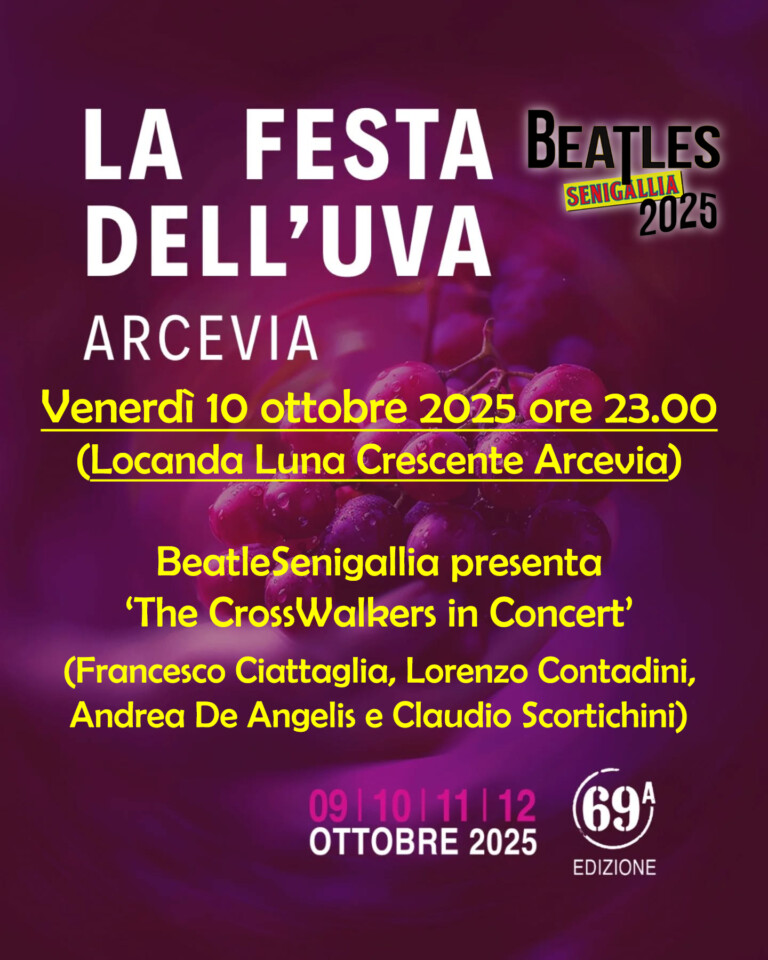 - Tra gli appuntamenti nelle Locande da segnalare BeatleSenigallia venerdì 10 ottobre alle 23 dove Vicolo del Colle, Locanda Luna Crescente e BeatleSenigallia presentano The CrossWalkers-Live Beatles Tribute Band (Francesco Ciattaglia basso; Lorenzo Contadinibatteria, voce; Andrea De Angelis chitarra solista, ukulele; Claudio Scortichini voce, chitarra, ukulele, tastiere).