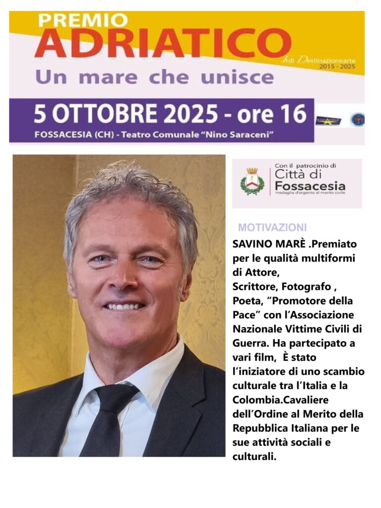 Si arricchisce di un nuovo, importante capitolo il percorso artistico di Savino Marè. Lo scrittore, attore, poeta e fotografo di Fermo ha ricevuto il prestigioso Premio Internazionale Adriatico – “Un Mare che Unisce” durante la sua settima edizione (2025), in una solenne cerimonia tenutasi presso il Teatro Comunale di Fossacesia.