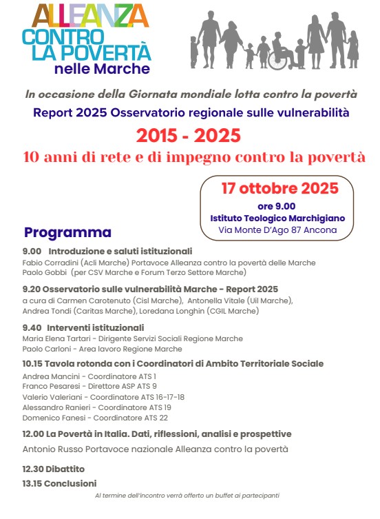 Dati, statistiche, rilevazioni e riflessioni per il contrasto alle disuguaglianze nelle Marche. La presentazione del Report 2025 dell’Osservatorio regionale sulle vulnerabilità è una occasione di riflessione e studio per i rappresentanti dei associazioni marchigiane, forze sociali e mondo della cooperazione impegnate sul tema della povertà e per le istituzioni. L’appuntamento pubblico, aperto agli esperti del settore e alla cittadinanza tutta, è venerdì 17 ottobre 2025, dalle ore 9.00 e per tutta la mattinata, all’Istituto Teologico Marchigiano di Ancona (Via Monte D’Ago 87), stessa data della Giornata mondiale per la lotta contro la povertà. Il seminario si tiene nel decimo anno di attività dell’Alleanza contro la povertà nelle Marche (2015 – 2025) , nata a Loreto nel 2025, su impulso di Acli Marche e da Caritas Marche con Cisl Marche, Cgil Marche, Uil Marche, Forum Regionale Terzo Settore, Csv Marche Ets, Confcooperative Marche, LegaCoop Marche, Adiconsum Marche, Gruppi di Volontariato Vincenziano, Banco Alimentare.
