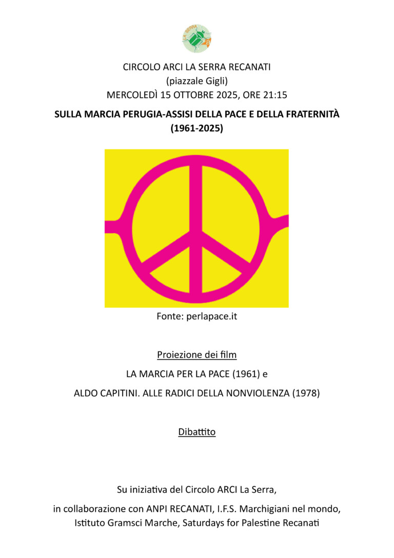 In collaborazione con ANPI RECANATI, I.F.S. Marchigiani nel mondo, Istituto Gramsci Marche e Saturdays for Palestine Recanati, il Circolo organizza per mercoledì 15 ottobre (ore 21:15) una iniziativa sulla Marcia Perugia-Assisi della pace e della fraternità (1961-2025), ideata da Aldo Capitini: proiezione dei film “La marcia per la pace” (1961) e “Aldo capitini. alle radici della nonviolenza” (1978), dibattito con partecipanti alla Marcia del 2025 ( evento Facebook: https://fb.me/e/3NiacimNP ).