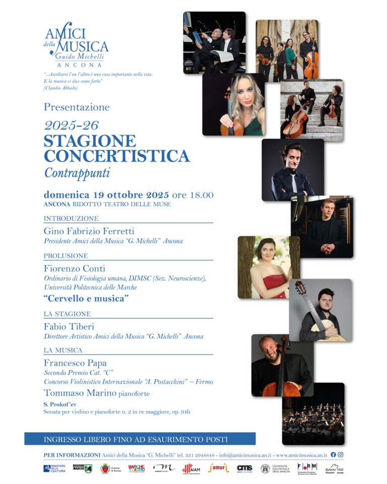Come lo scorso anno, la stagione Contrappunti si apre con un’anteprima, ad ingresso libero, che si terrà domenica 19 ottobre alle ore 18, al Ridotto del Teatro delle Muse di Ancona in cui ci sarà una riflessione sull’ascolto, oltre all’illustrazione della proposta artistica 2025/2026 e alla esibizione di due giovani talenti. Ospite speciale per la prolusione, il professore Fiorenzo Conti, Ordinario di Fisiologia umana DIMSC (Sezione Neuroscienze) dell’Università Politecnica delle Marche che interverrà sul tema ”Cervello e Musica”. A seguire il duo formato da Francesco Papa (violino) e Tommaso Marino (pianoforte) che eseguirà la Sonata n. 2 per violino e pianoforte op. 94b di S. Prokof’ev.