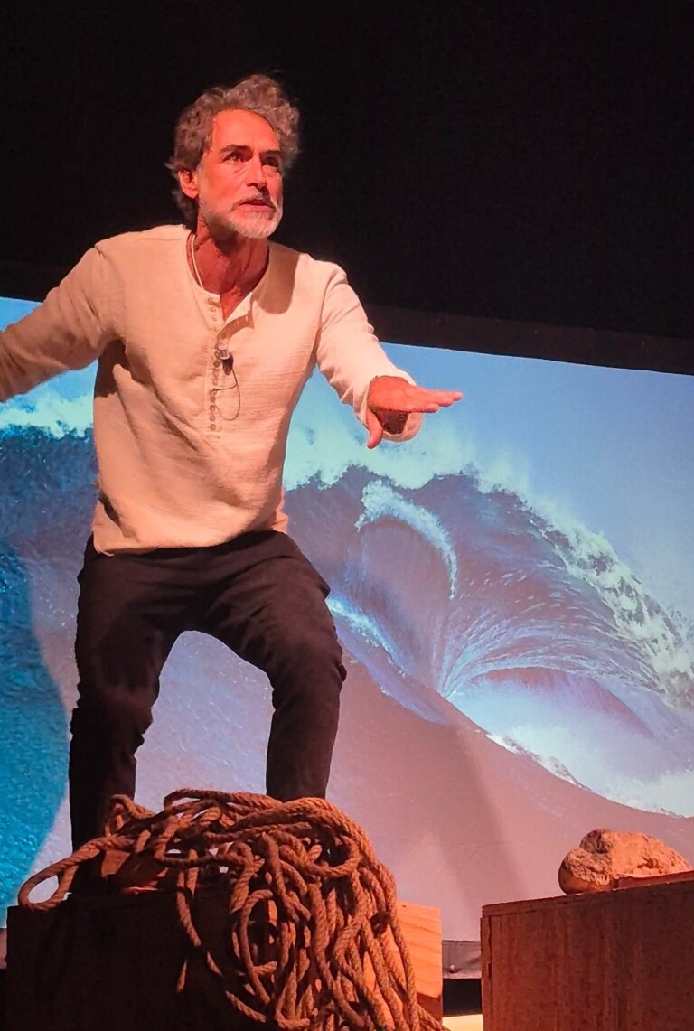 Il titolo non è casuale: il mare diventa la metafora del flusso della vita, delle sue sfide, dei momenti di quiete e di tempesta. Muniz accompagna il pubblico in un viaggio personale e universale, dove le emozioni scorrono come onde che travolgono e accarezzano allo stesso tempo. La forza dello spettacolo risiede nella sua fusione di linguaggi. Muniz non è soltanto interprete delle parole, ma anche della musica, che assume un ruolo centrale nella narrazione. Accompagnato dalla sua inseparabile chitarra, l’attore esegue brani che si intrecciano perfettamente con il racconto, dando vita a momenti di intensa partecipazione emotiva. “Surf e chitarra sono due tavole, una per cavalcare le onde del mare e una per cavalcare le onde sonore”, spiega Muniz, riassumendo con poetica semplicità il cuore del suo lavoro artistico.