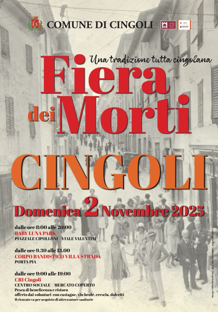Torna anche quest’anno, domenica 2 novembre, la “Fiera dei Morti”, uno degli eventi più radicati nella tradizione cingolana. La manifestazione, che affonda le sue origini nel XIX secolo, è documentata già nel 1856 da un avviso del Gonfaloniere di Cingoli, quando il borgo godeva del privilegio, concesso dal Governo Pontificio, di celebrare fiere di merci e bestiame, a testimonianza del suo ruolo economico strategico nel territorio.