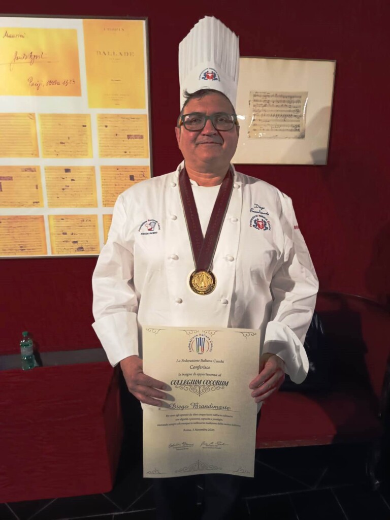 Importante traguardo professionale per il professor Diego Brandimarte, stimato chef sambenedettese e docente di Enogastronomia, che è stato insignito a Roma, presso il Teatro Ghione, del Collare Collegium Cocorum – una delle massime onorificenze conferite dalla Federazione Italiana Cuochi.