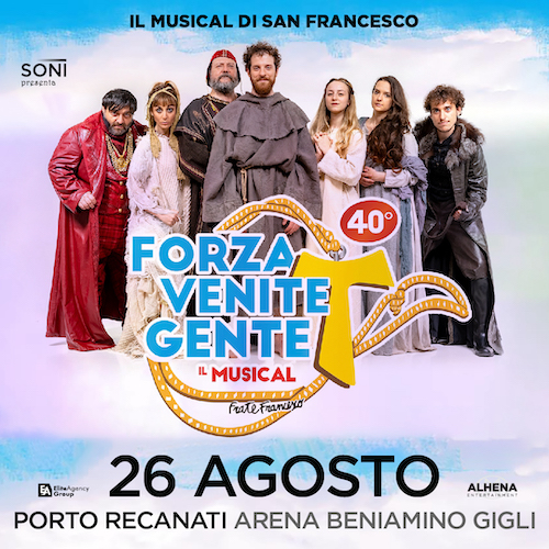Sabato 26 agosto 2023, all’Arena Beniamino Gigli di Porto Recanati va in scena il musical “Forza Venite Gente”, nuova data nelle Marche dopo il sold out con standing ovation al teatro Le Muse di Ancona. Il musical di San Francesco si ispira alla prima versione di 40 anni fa pluripremiata dall’incredibile successo di pubblico e di critica.
