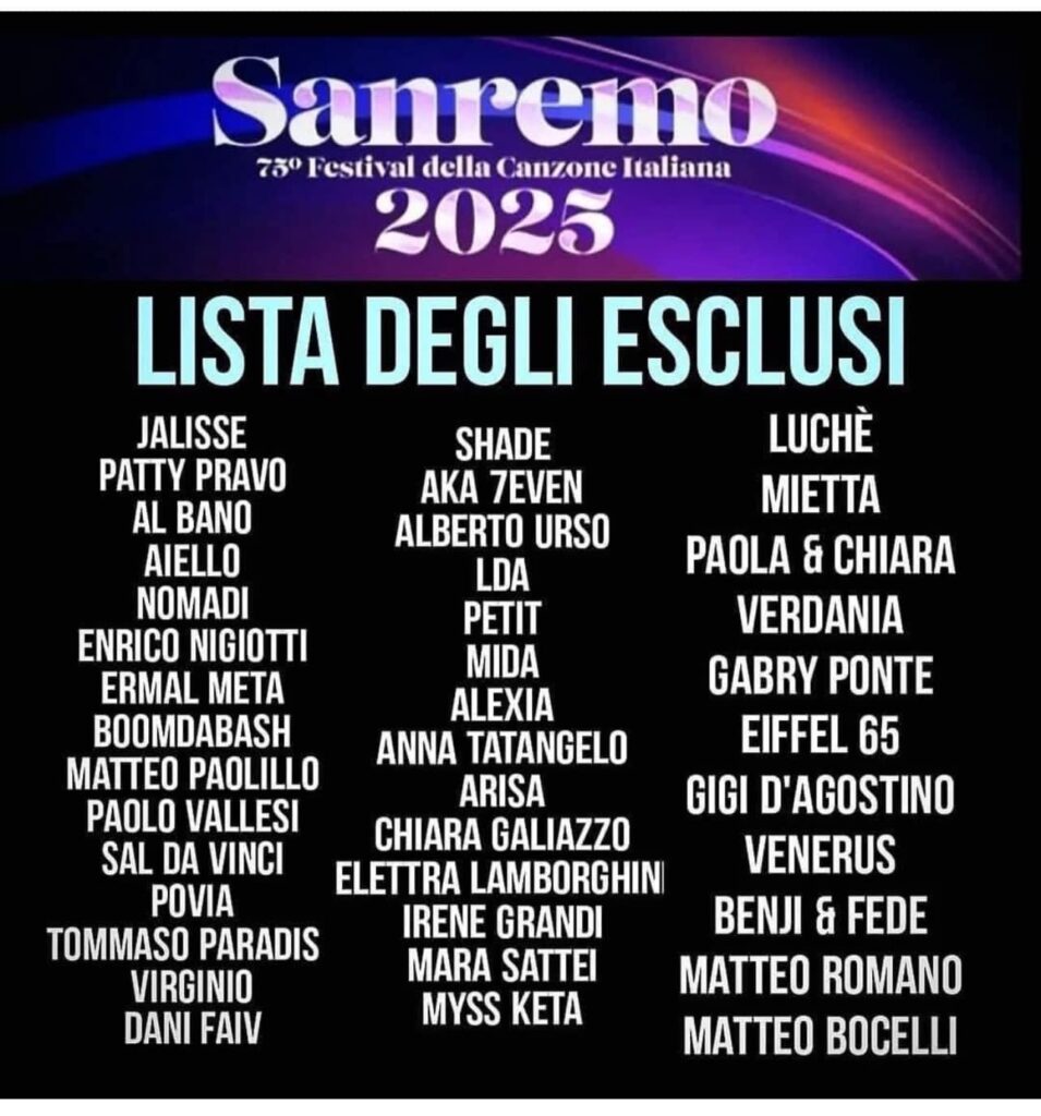 All’entusiasmo dei 30 Big scelti da Carlo Conti per la gara di Sanremo 2025 fa da contraltare, puntuale come ogni anno, la delusione di chi si era candidato ma non è stato scelto. C’è chi è rimasto in silenzio come Al Bano, chi ha brindato all’ennesima esclusione come i Jalisse, chi è sbottato come Sfera Ebbasta e chi ha reagito con ironia come Shade.