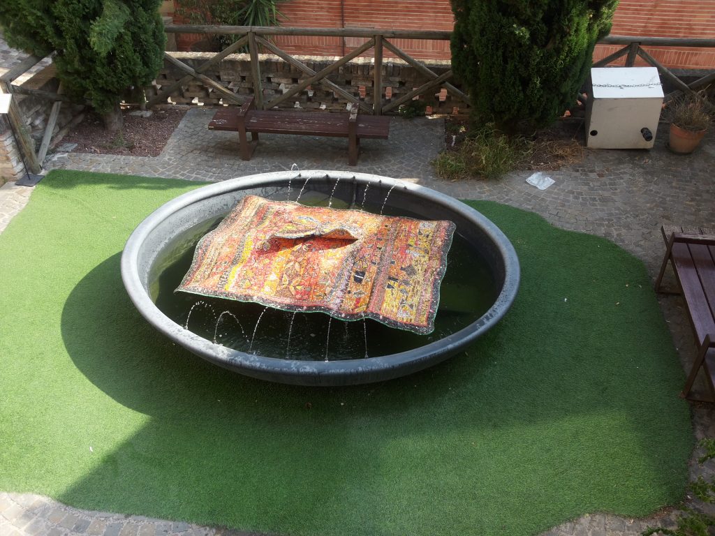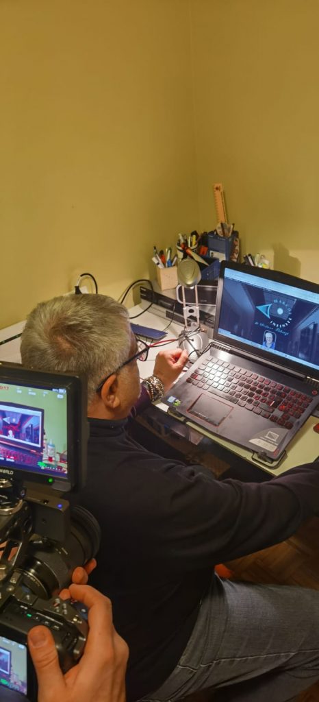 Entriamo in casa, piena di disegni, mobili, statue, foulard, lampade, ninnoli e gadget, tutte opere realizzate dal Maestro negli anni, vere e proprie opere d’arte che spesso finiscono in mostre organizzate dall’omonima associazione (oggi Fondazione) del luogo. E, in mezzo a quella congèrie di fantastici oggetti, si aggirano anche cani e tanti gatti, persino dentro il mobile che regge il televisore.