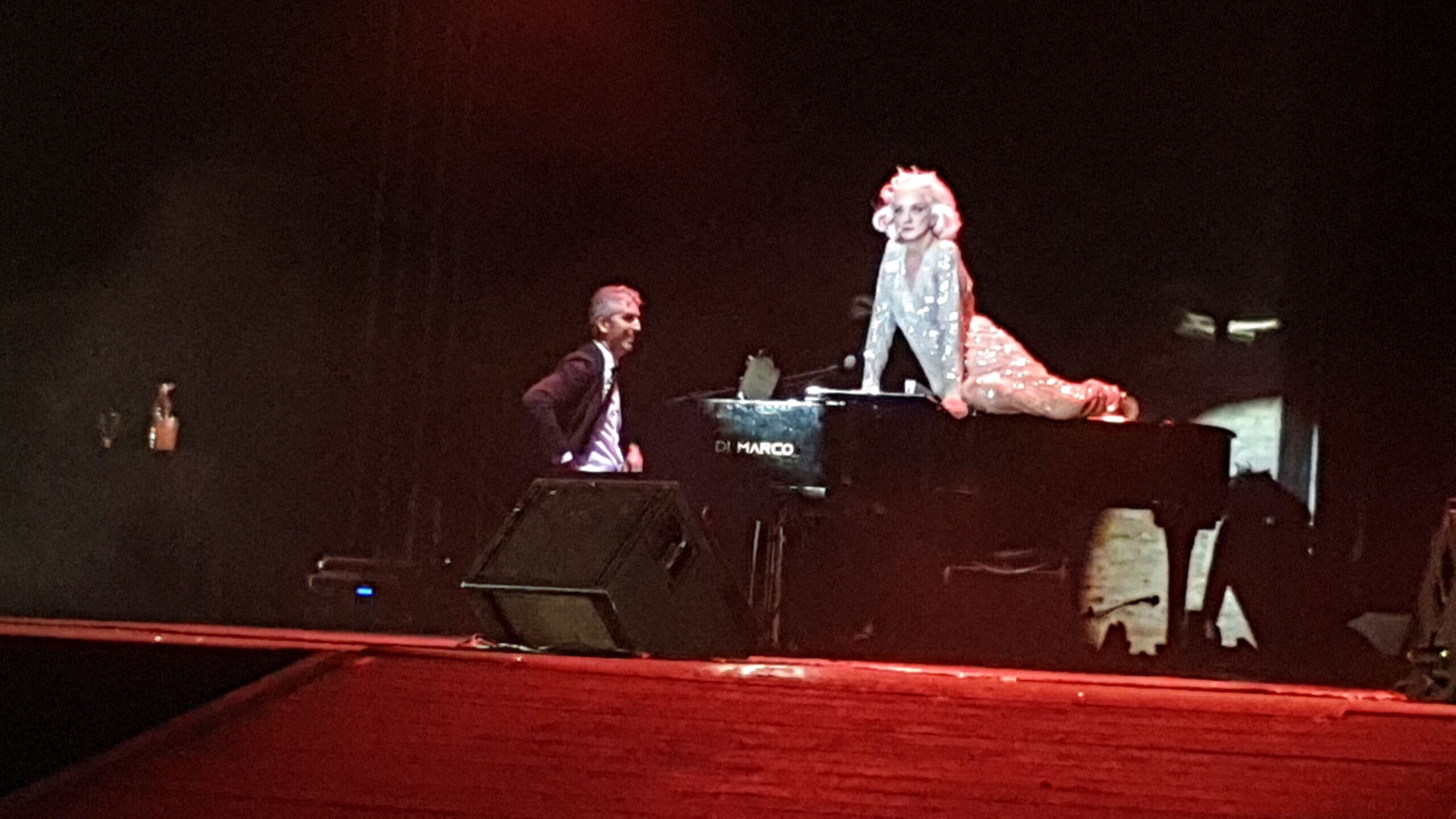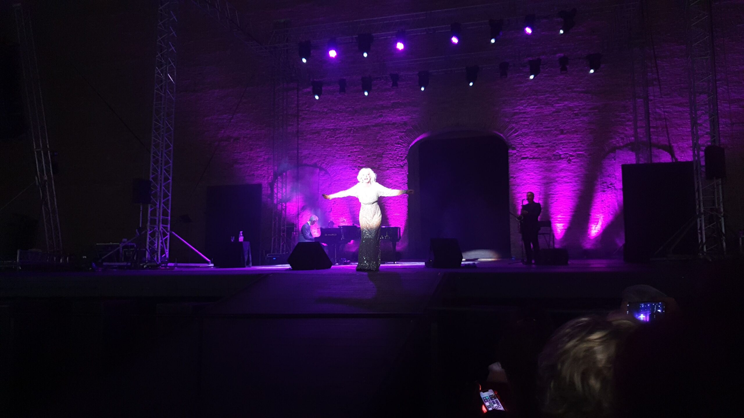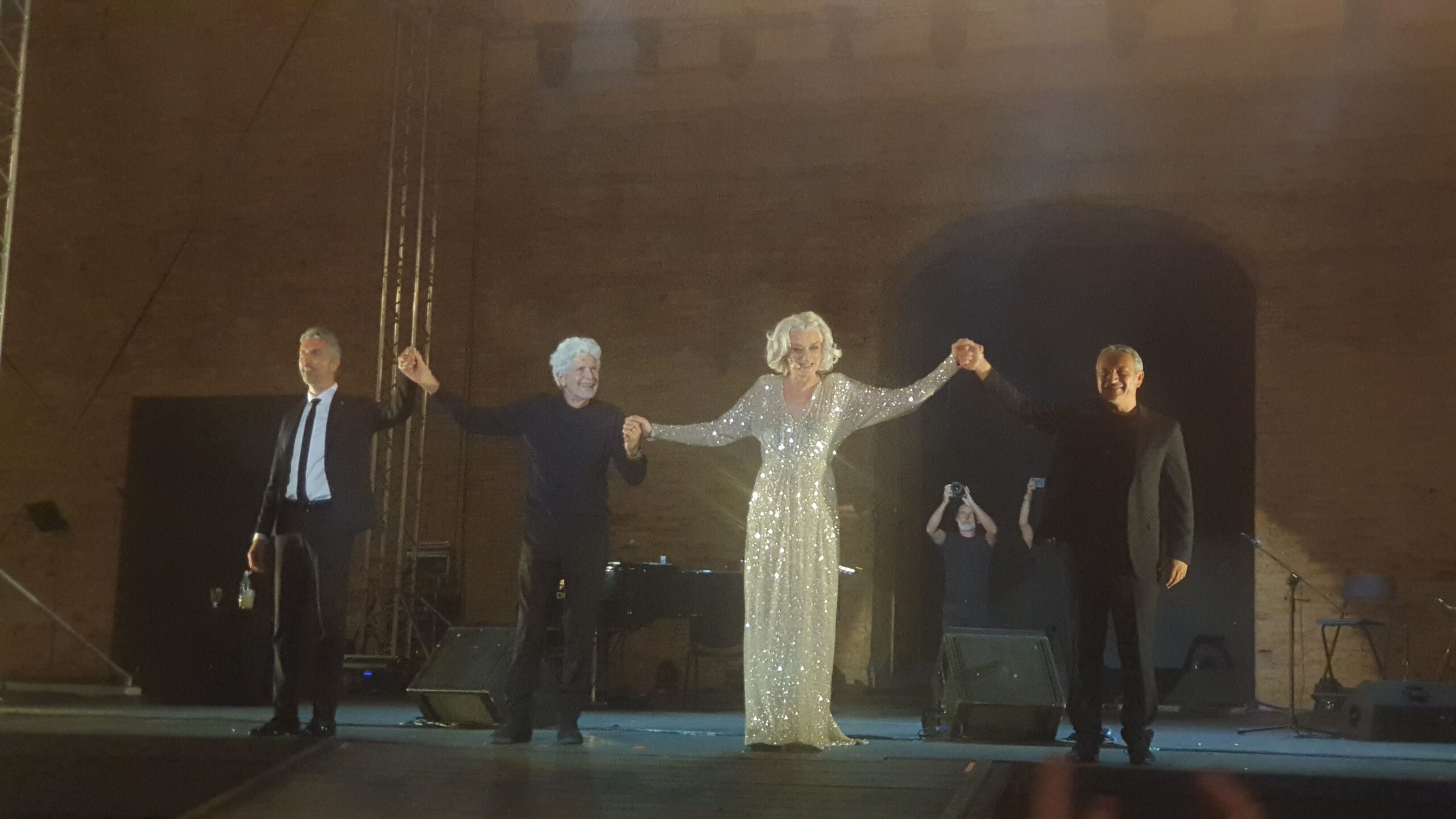 Gianluca Gori ormai è Drusilla Foer e viceversa. L’attore toscano che ha inventato questo personaggio lo sta facendo crescere a ogni spettacolo. Lo abbiamo incontrato prima a Sanremo per il Festival, poi recentemente a Pesaro con il suo tour Eleganzissima Estate che ha visto tutte le date sold out. Il ritrovarlo/a allo Sferisterio il 29 agosto è un piacere. Lo schema dello show è quello che abbiamo già visto anche se delle variazioni se le concede di sera in sera. “Siamo attori – ci dice nel backstage – ma anche esseri umani e avvertiamo le vibrazioni del pubblico e queste ci stimolano a uscire dalla scaletta. Questa sera allo Sferisterio ho provato, anzi abbiamo provato con i miei compagni di viaggio, emozioni fortissime. Non eravamo mai venuti in questo luogo, che è bellissimo, e vederlo con tanta gente gratifica e ti riempie di responsabilità”. I suoi compagni di viaggio sul palco sono al pianoforte Loris Di Leo e al sax e clarinetto Nico Gori (elemento fisso nel quartetto di Stefano Bollani). E poi c’è alla chitarra Franco Godi che ha scoperto Gianluca e ora ne è il produttore e cura la direzione artistica dello spettacolo.