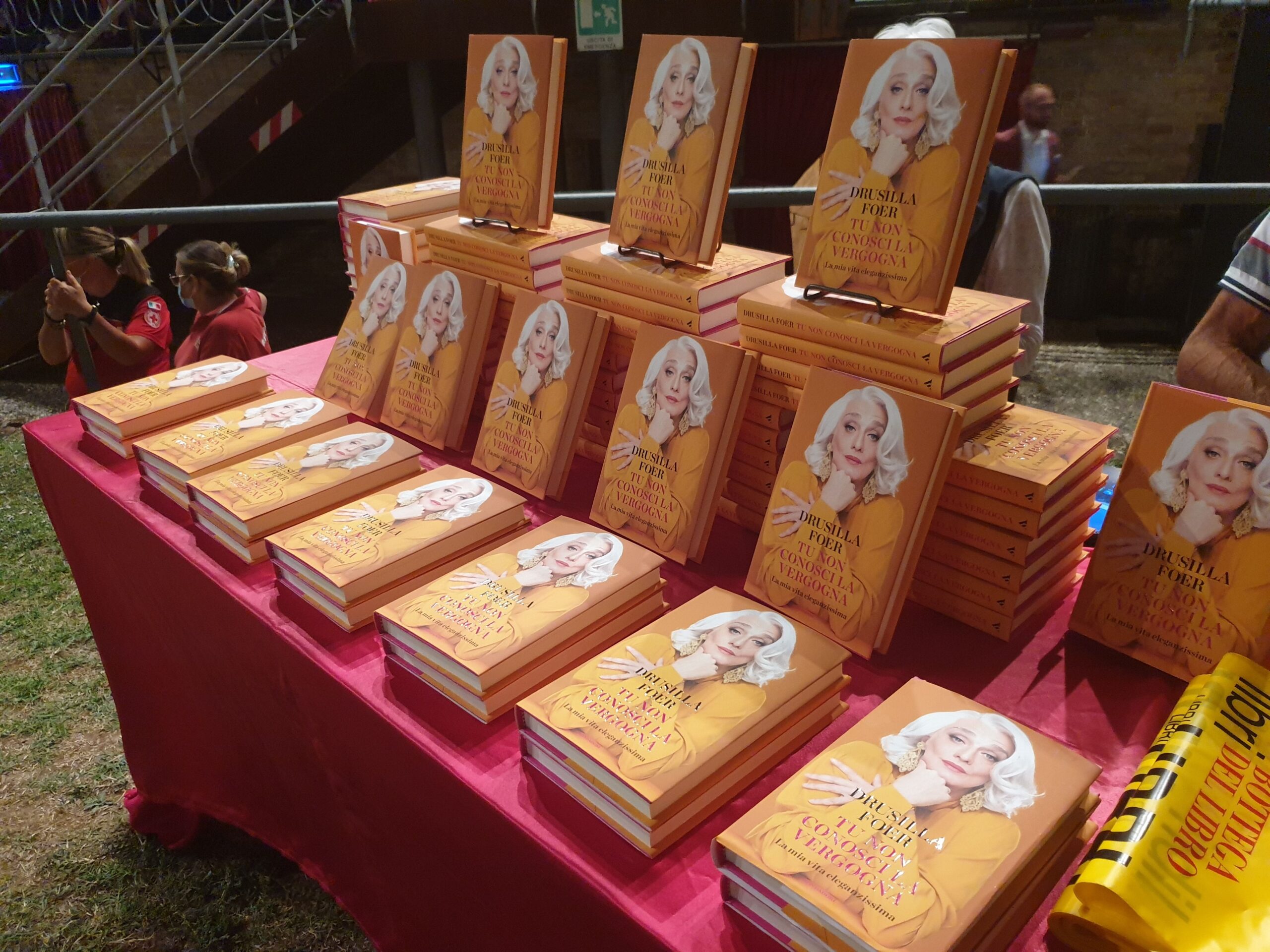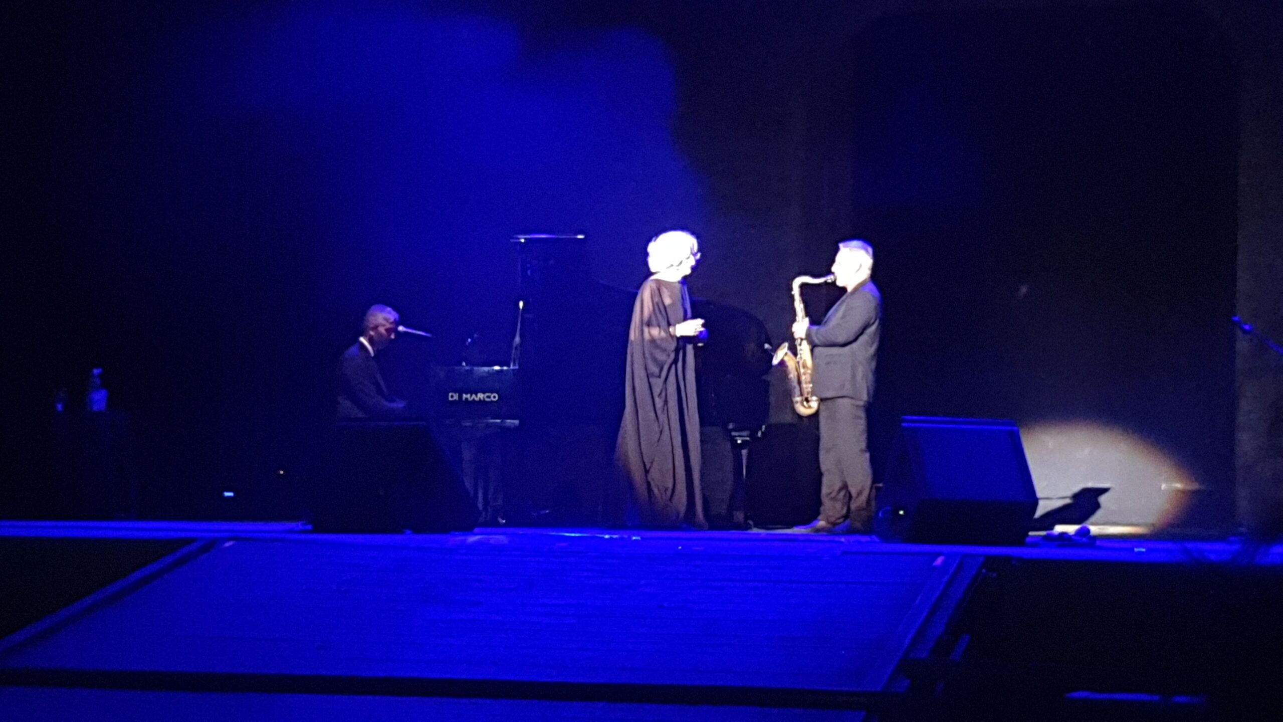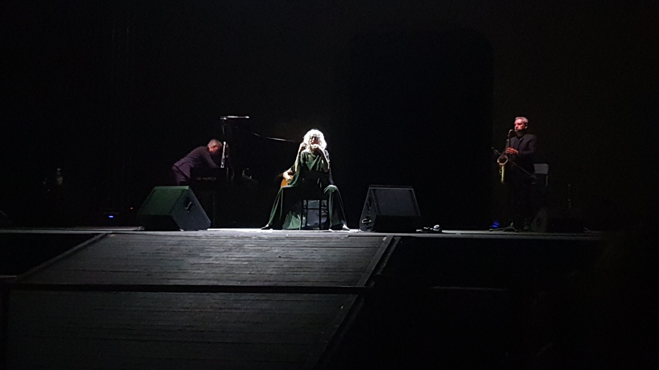 Gianluca Gori ormai è Drusilla Foer e viceversa. L’attore toscano che ha inventato questo personaggio lo sta facendo crescere a ogni spettacolo. Lo abbiamo incontrato prima a Sanremo per il Festival, poi recentemente a Pesaro con il suo tour Eleganzissima Estate che ha visto tutte le date sold out. Il ritrovarlo/a allo Sferisterio il 29 agosto è un piacere. Lo schema dello show è quello che abbiamo già visto anche se delle variazioni se le concede di sera in sera. “Siamo attori – ci dice nel backstage – ma anche esseri umani e avvertiamo le vibrazioni del pubblico e queste ci stimolano a uscire dalla scaletta. Questa sera allo Sferisterio ho provato, anzi abbiamo provato con i miei compagni di viaggio, emozioni fortissime. Non eravamo mai venuti in questo luogo, che è bellissimo, e vederlo con tanta gente gratifica e ti riempie di responsabilità”. I suoi compagni di viaggio sul palco sono al pianoforte Loris Di Leo e al sax e clarinetto Nico Gori (elemento fisso nel quartetto di Stefano Bollani). E poi c’è alla chitarra Franco Godi che ha scoperto Gianluca e ora ne è il produttore e cura la direzione artistica dello spettacolo.