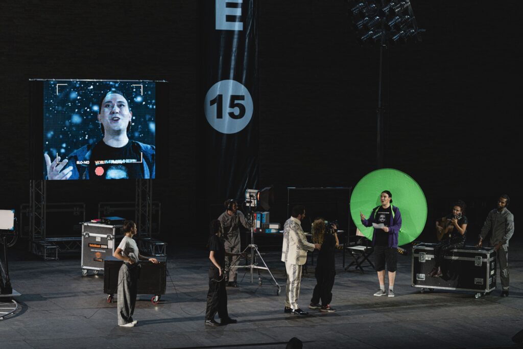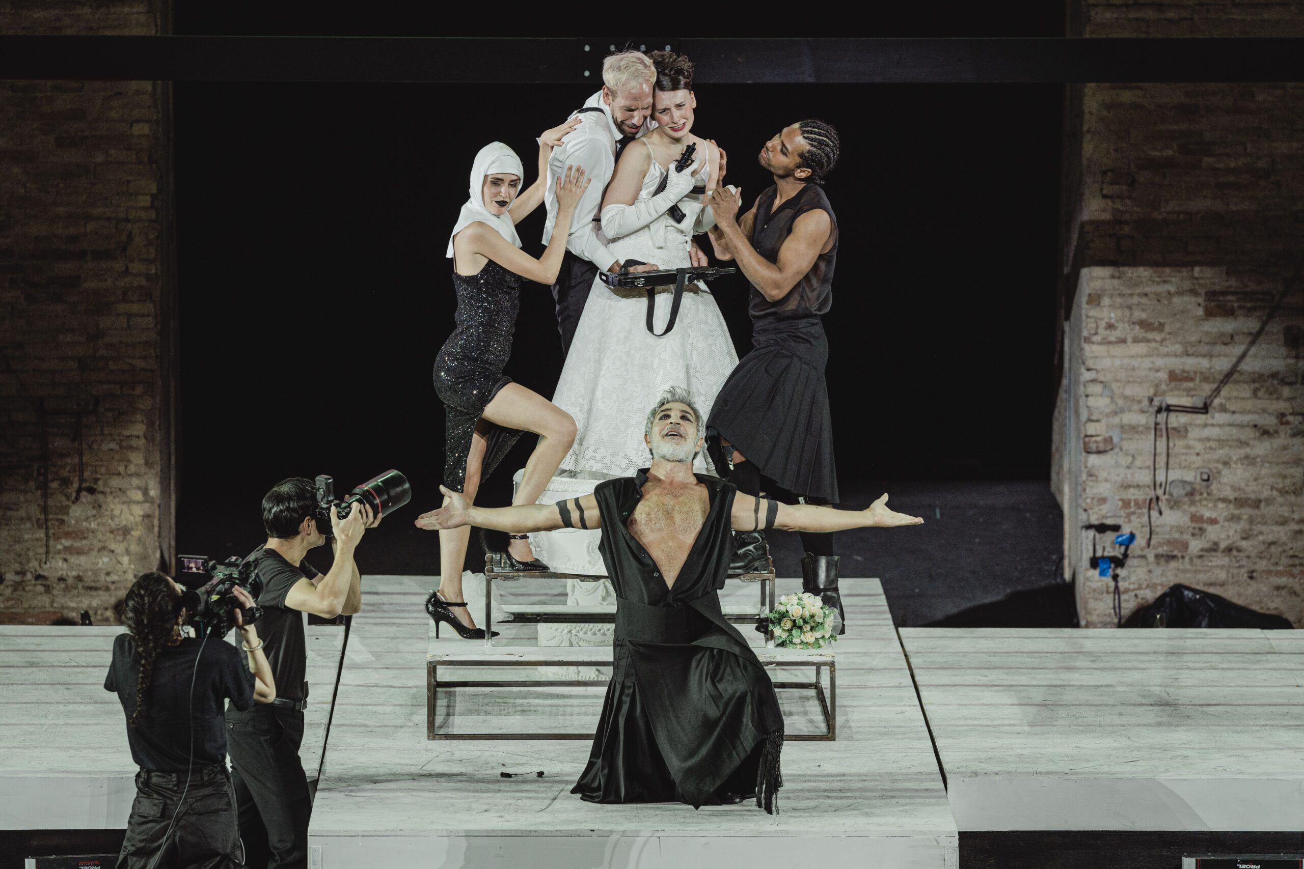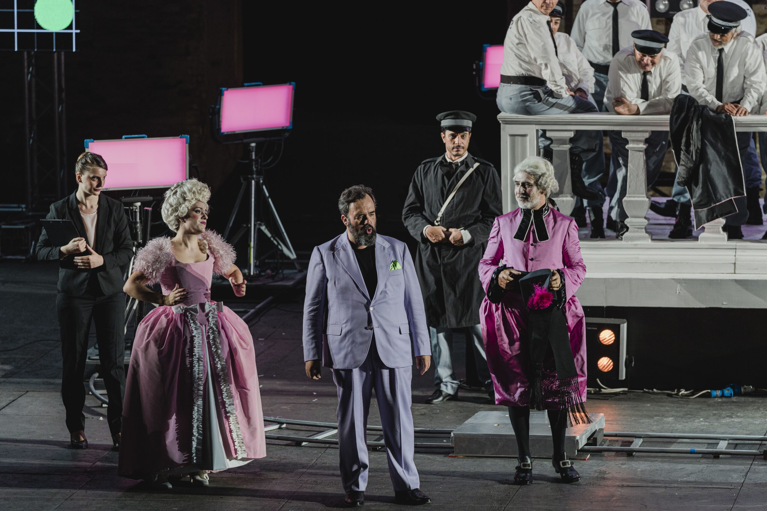 La scena, come abbiamo detto, è quella di un set tv, dove arrivano auto e monopattini. Il coro ha la divisa della security. Come nella Tosca, il tocco kitsch non manca in particolare nei costumi. Lo Sferisterio aiuta a dilatare gli spazi, ma in questo caso risulta dispersivo per le diverse azioni che si svolgono da un capo all’altro del palco. Anche qua c’è l’uso delle video camere che riprendono e trasmettono sul muro dell’Arena.