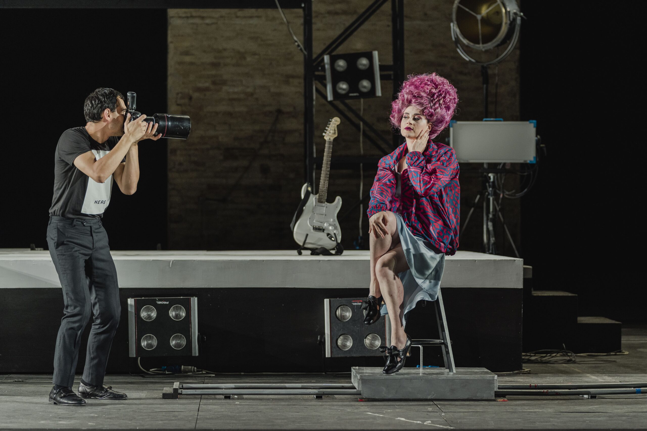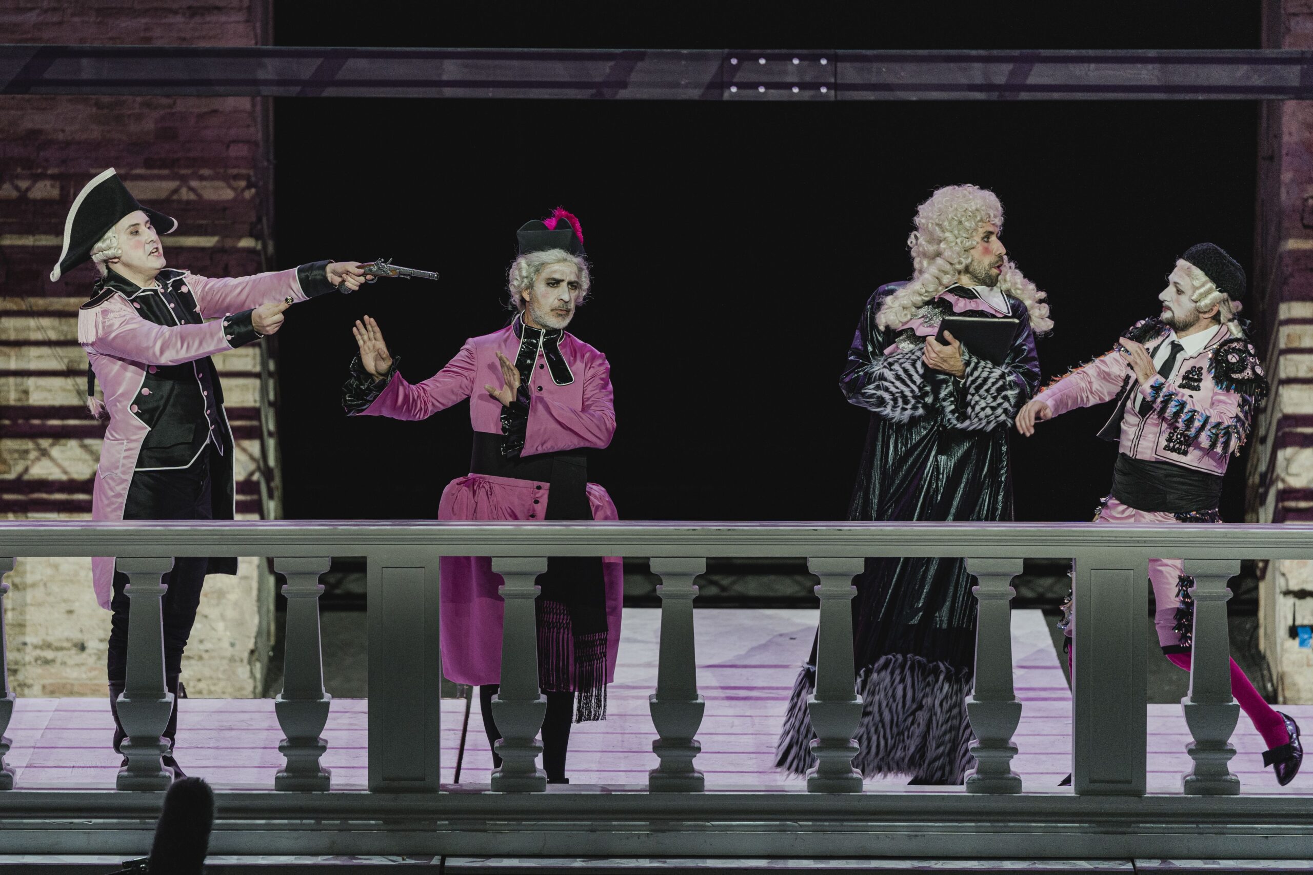 Nella Tosca ci siamo trovati nel Teatro 5 di Cinecittà tra Batman e altri eroi degli Anni 50 che gironzolano per gli studi mentre Mario Cavaradossi fa il suo ingresso. La regia di Valentina Carrasco sviluppa appunto l’idea di trasportare la vicenda dell’eroina dell’opera pucciniana in un teatro di posa dove si sta girando una pellicola ambientata nel 1800 prodotta da Scarpia. Mario e Tosca sono attori di questo film e intrecciano le loro vicende personali con quelle dei personaggi che interpretano. Quindi c’è una alternanza di finzione e realtà di riprese in bianco e nero e riprese a colori con le proiezioni sul muro dello Sferisterio. Ambiente kitsch, ma ci sta. Perché ricordiamo la Tosca? Perché abbiamo trovato molto di quella messa in scena in questo Barbiere firmato da Daniele Menghini.