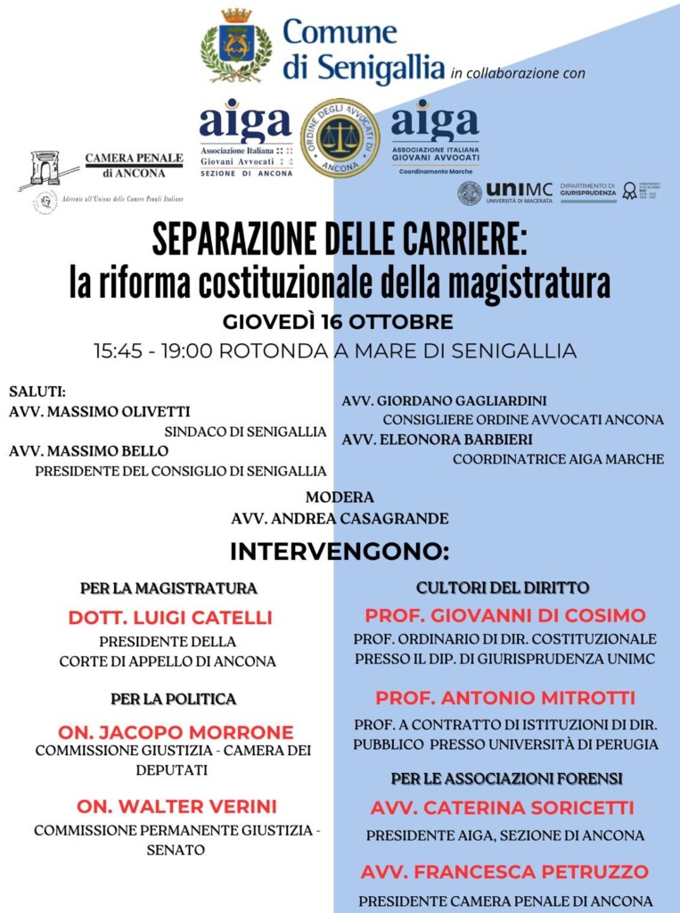 Conferenza sulla separazione delle carriere giovedì 16 ottobre alle ore 15,45. Alla Rotonda a Mare di Senigallia si parla della riforma costituzionale della magistratura
