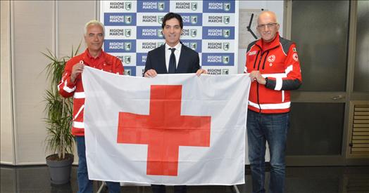 Giornata internazionale della Croce Rossa, il Comitato regionale Marche consegna la bandiera al presidente della Regione Acquaroli: il vessillo sventola a Palazzo Raffaello
