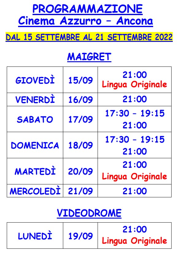 Cinema Azzurro di Ancona: la programmazione dal 15 al 21 settembre